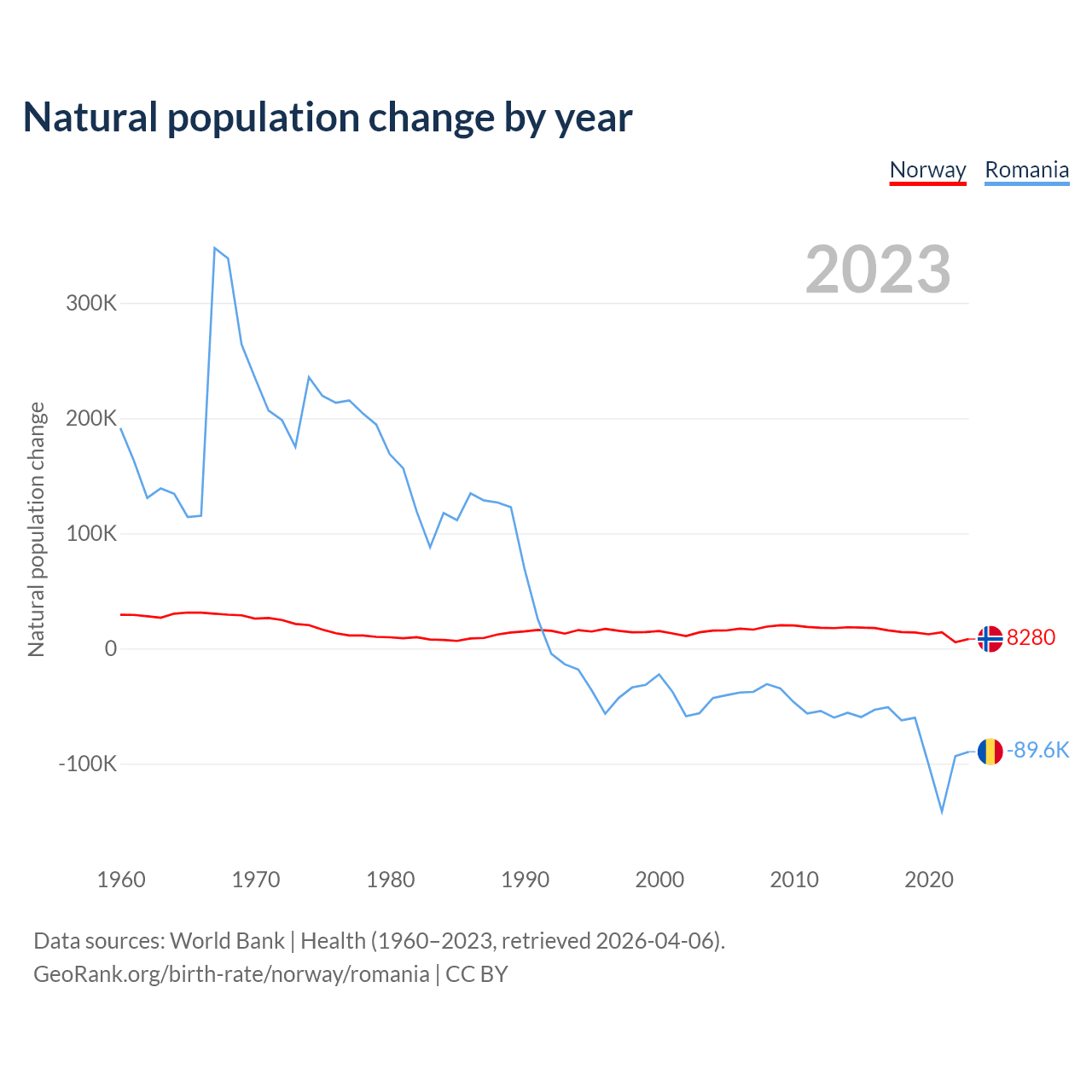 According to the latest available data on birth rates, the fertility rate in Norway was 1.4 children per woman in 2023, compared to 1.71 in Romania in 2023. The replacement level is considered to be 2.1 children per woman.