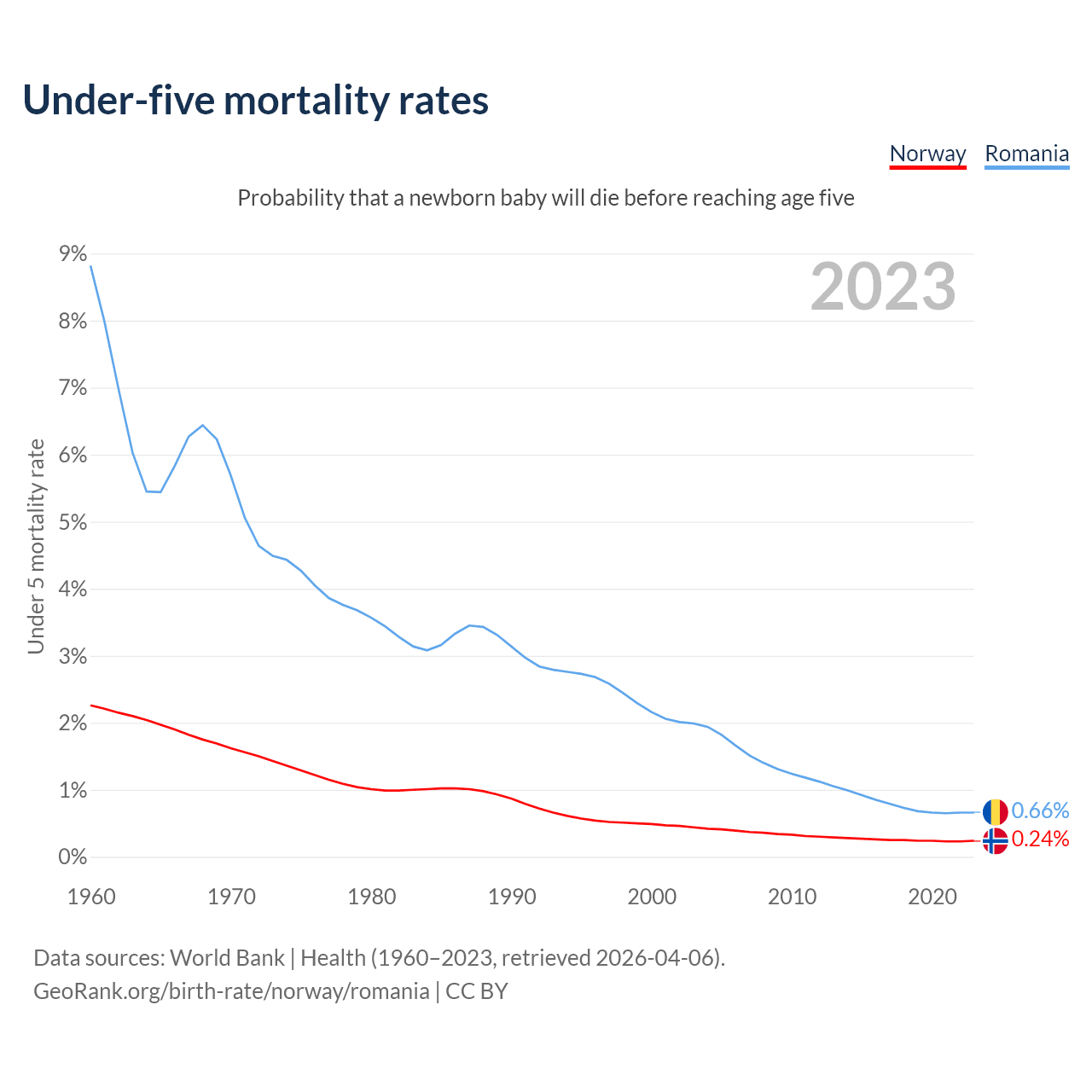 The chance that a newborn baby will die before reaching age five is 0.24% in Norway and 0.66% in Romania. Above is a chart with historical data on under-five mortality rates.