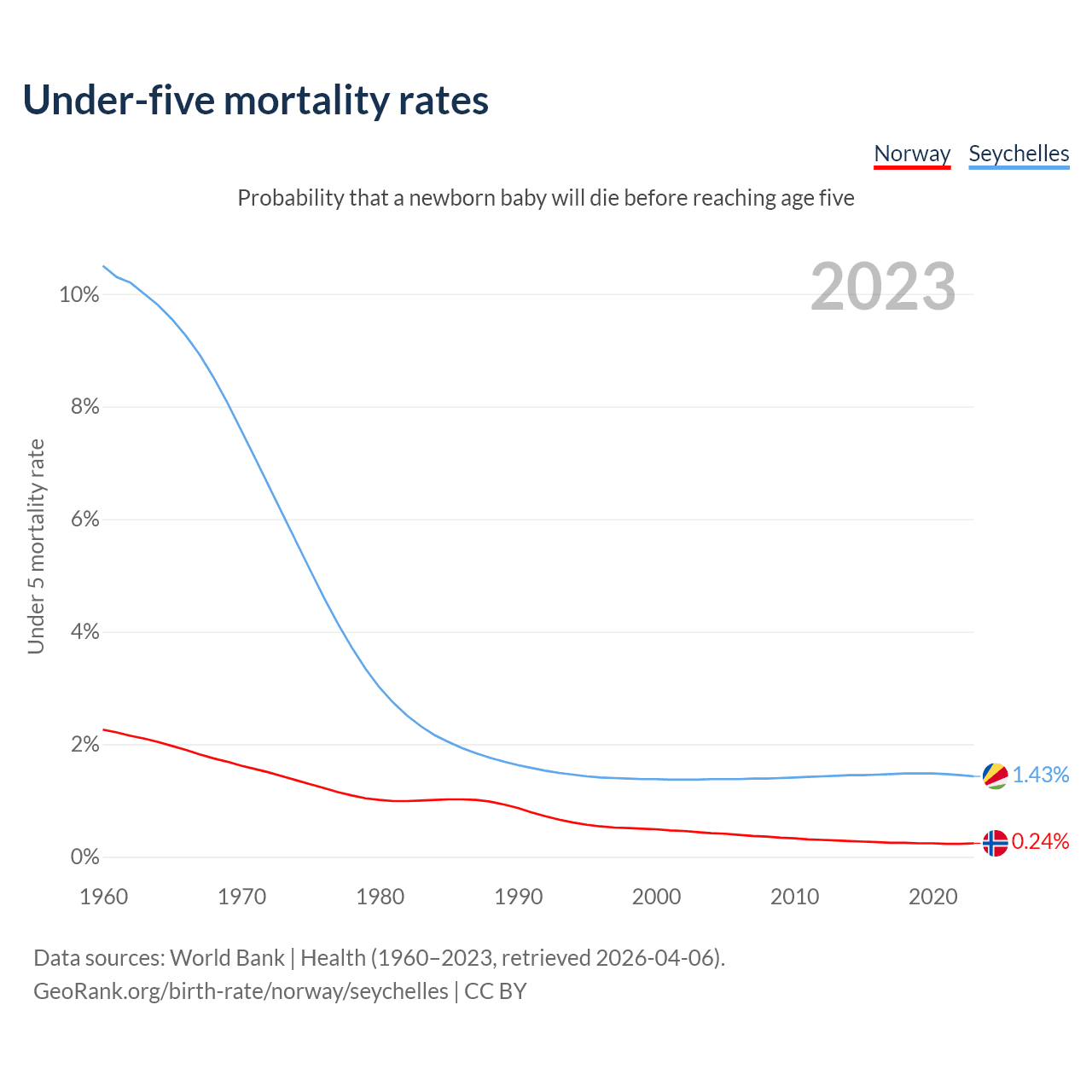 The chance that a newborn baby will die before reaching age five is 0.24% in Norway and 1.43% in the Seychelles. Above is a chart with historical data on under-five mortality rates.