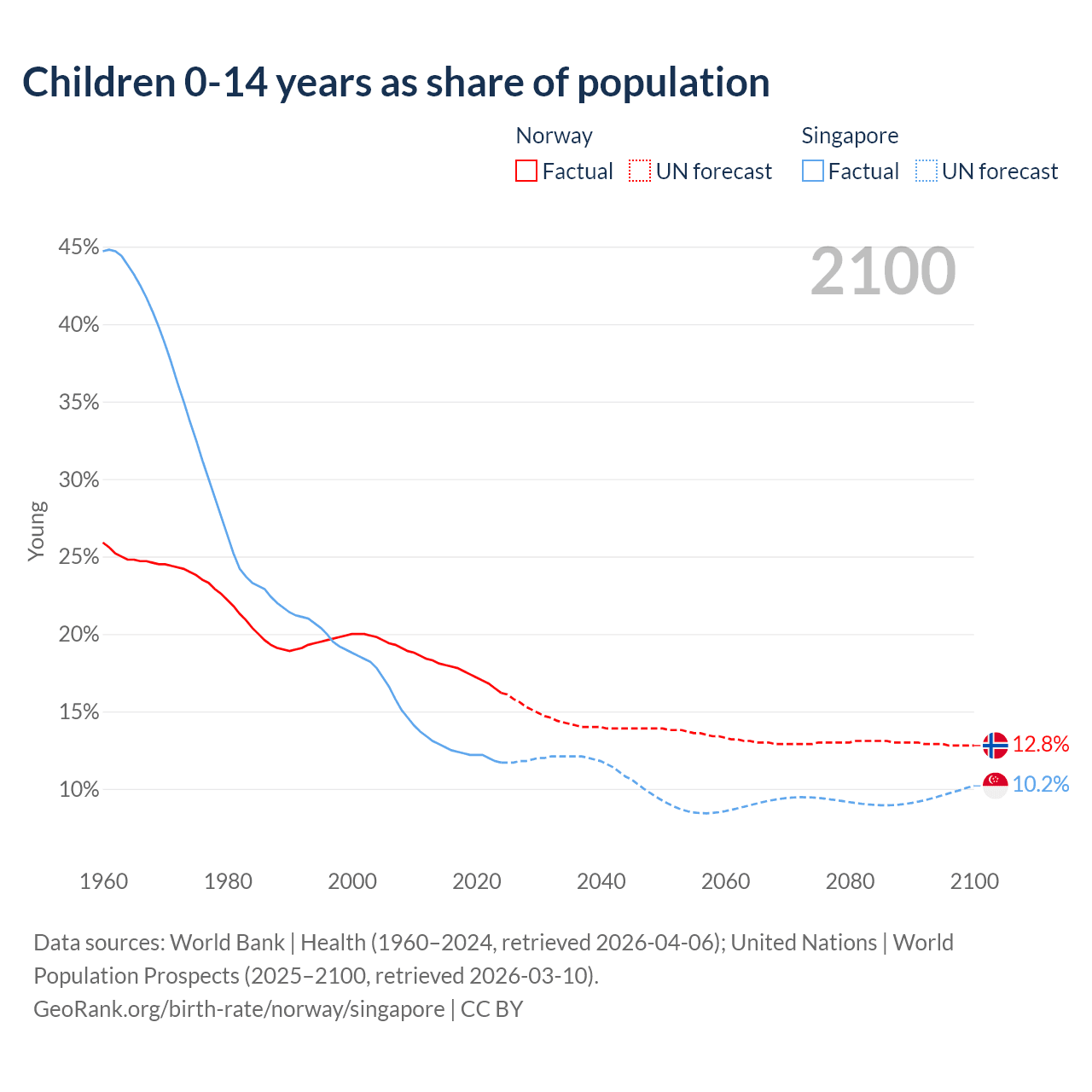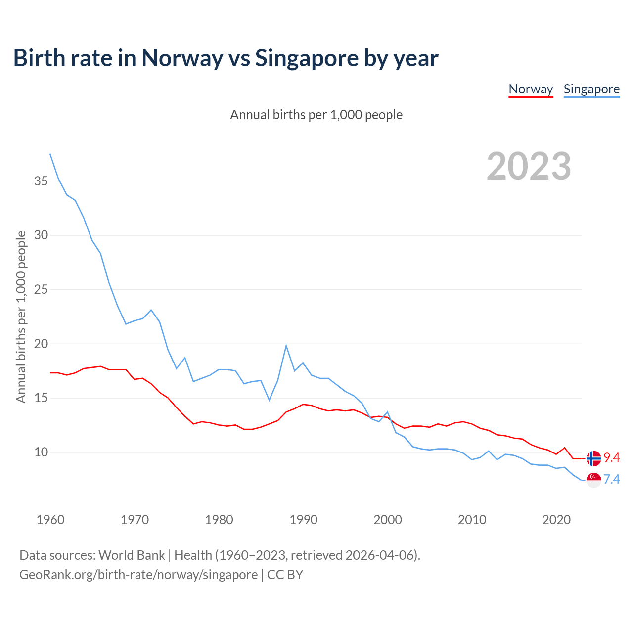 According to the latest available data on birth rates, the fertility rate in Norway was 1.4 children per woman in 2023, compared to 0.97 in Singapore in 2023. The replacement level is considered to be 2.1 children per woman.