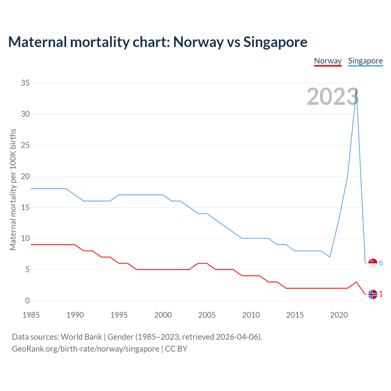 The maternal mortality rate, which is the probability of dying during childbirth or within 42 days of pregnancy termination, is 1 deaths per 100,000 live births in Norway, compared to 6 deaths in Singapore.