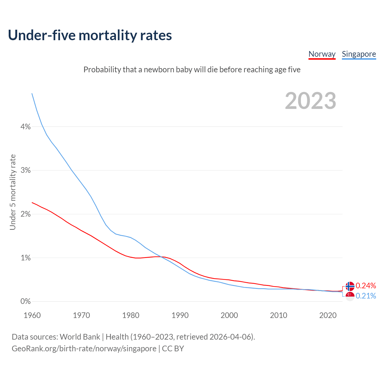 The chance that a newborn baby will die before reaching age five is 0.24% in Norway and 0.21% in Singapore. Above is a chart with historical data on under-five mortality rates.