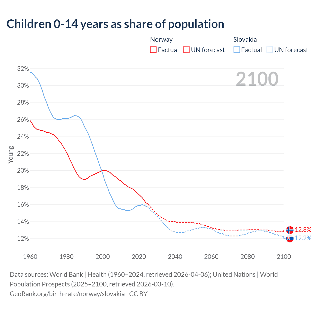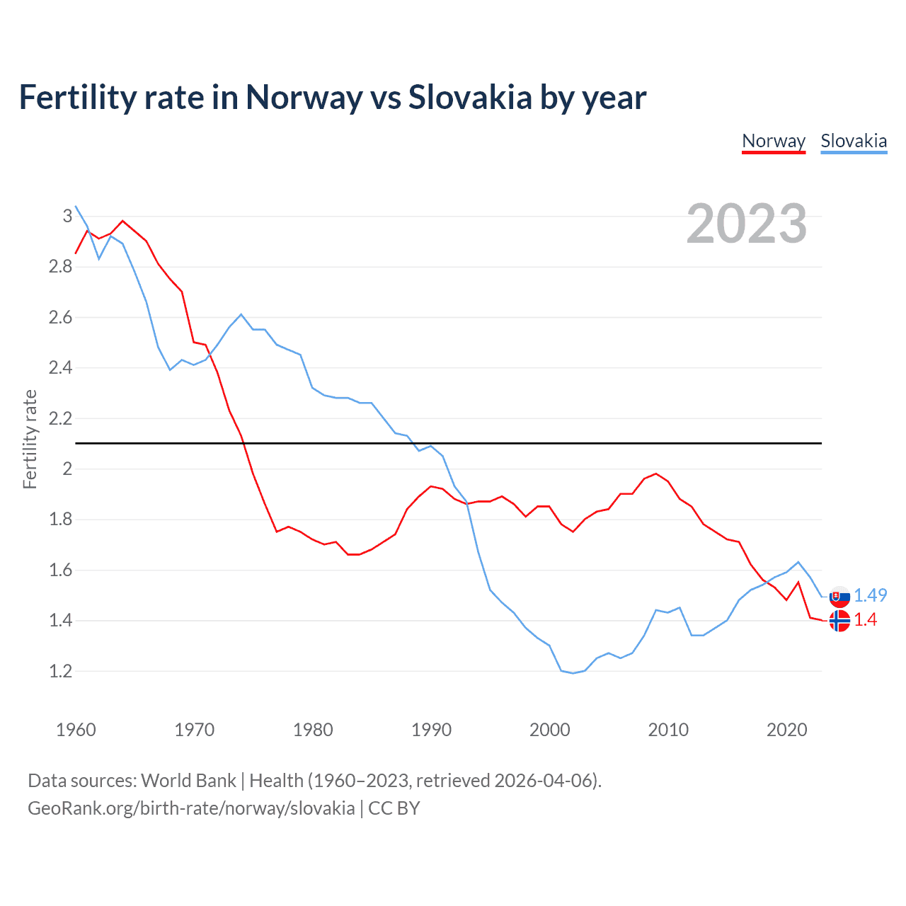 According to the latest available data on birth rates, the fertility rate in Norway was 1.4 children per woman in 2023, compared to 1.49 in Slovakia in 2023. The replacement level is considered to be 2.1 children per woman.
