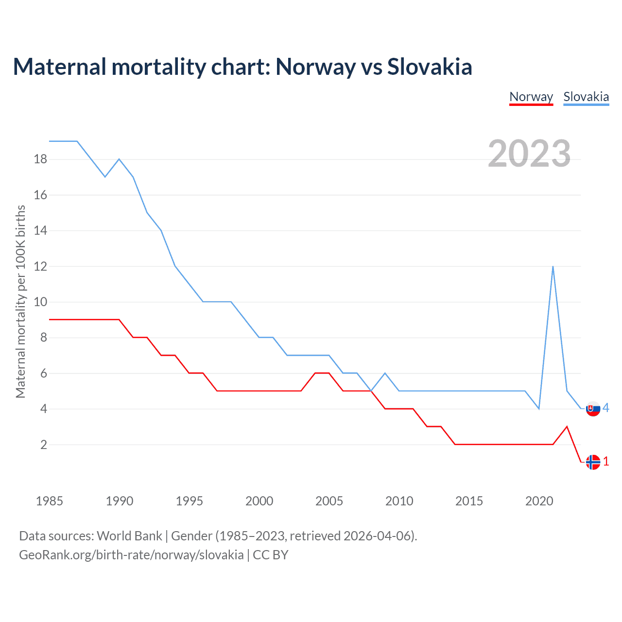 The maternal mortality rate, which is the probability of dying during childbirth or within 42 days of pregnancy termination, is 1 deaths per 100,000 live births in Norway, compared to 4 deaths in Slovakia.