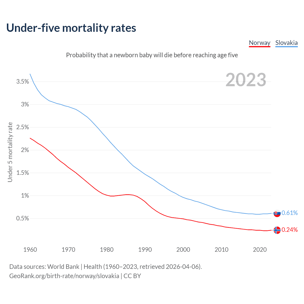 The chance that a newborn baby will die before reaching age five is 0.24% in Norway and 0.61% in Slovakia. Above is a chart with historical data on under-five mortality rates.