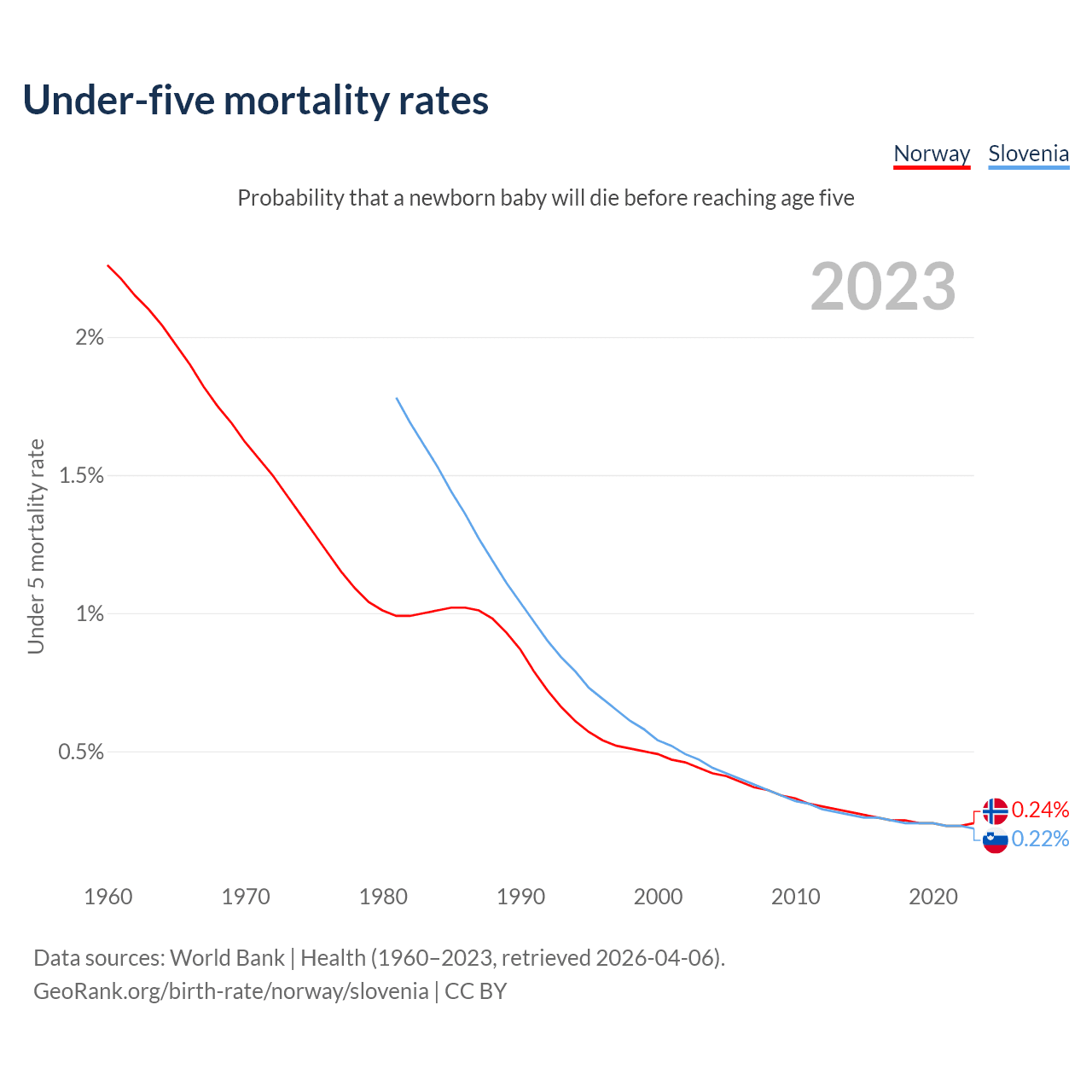 The chance that a newborn baby will die before reaching age five is 0.24% in Norway and 0.22% in Slovenia. Above is a chart with historical data on under-five mortality rates.
