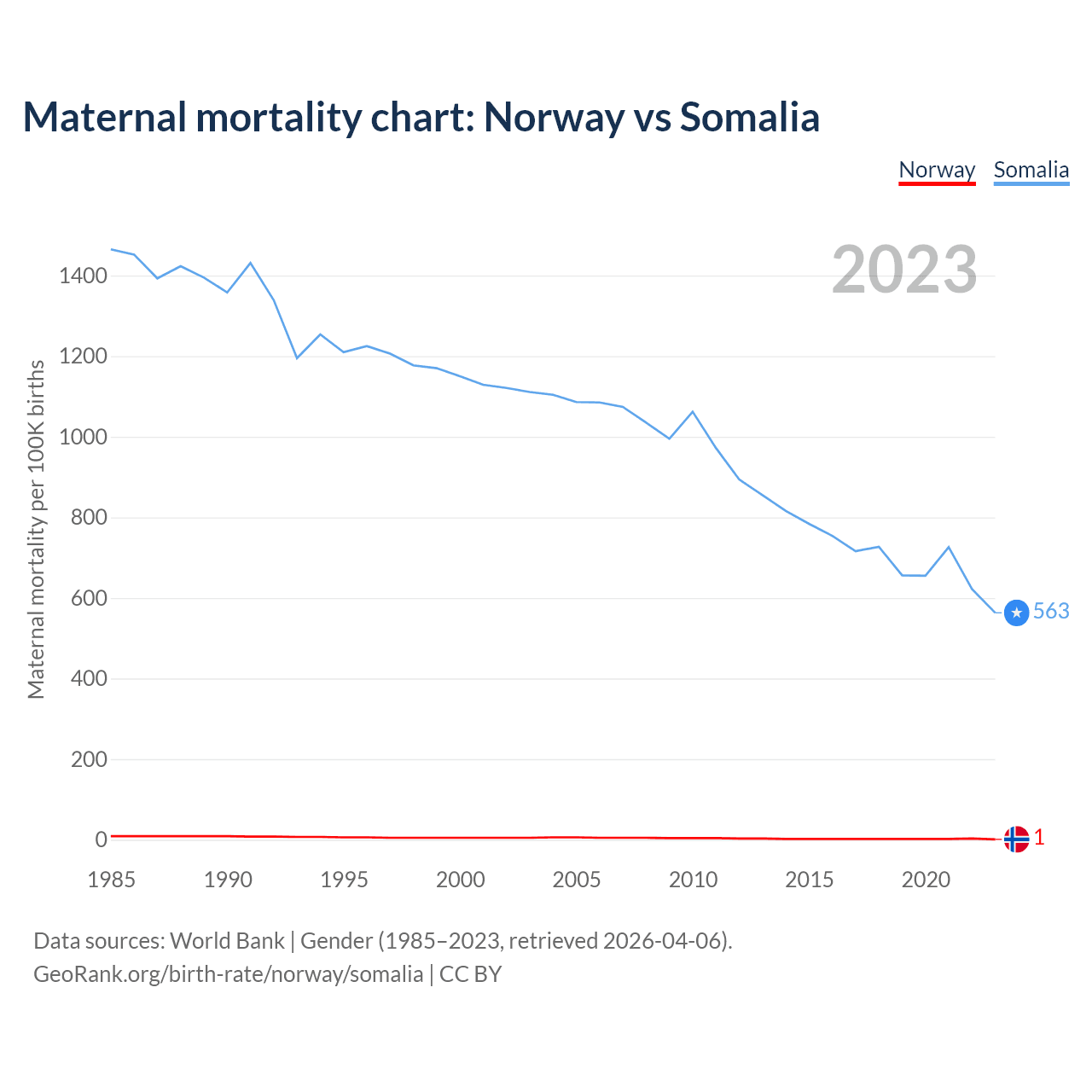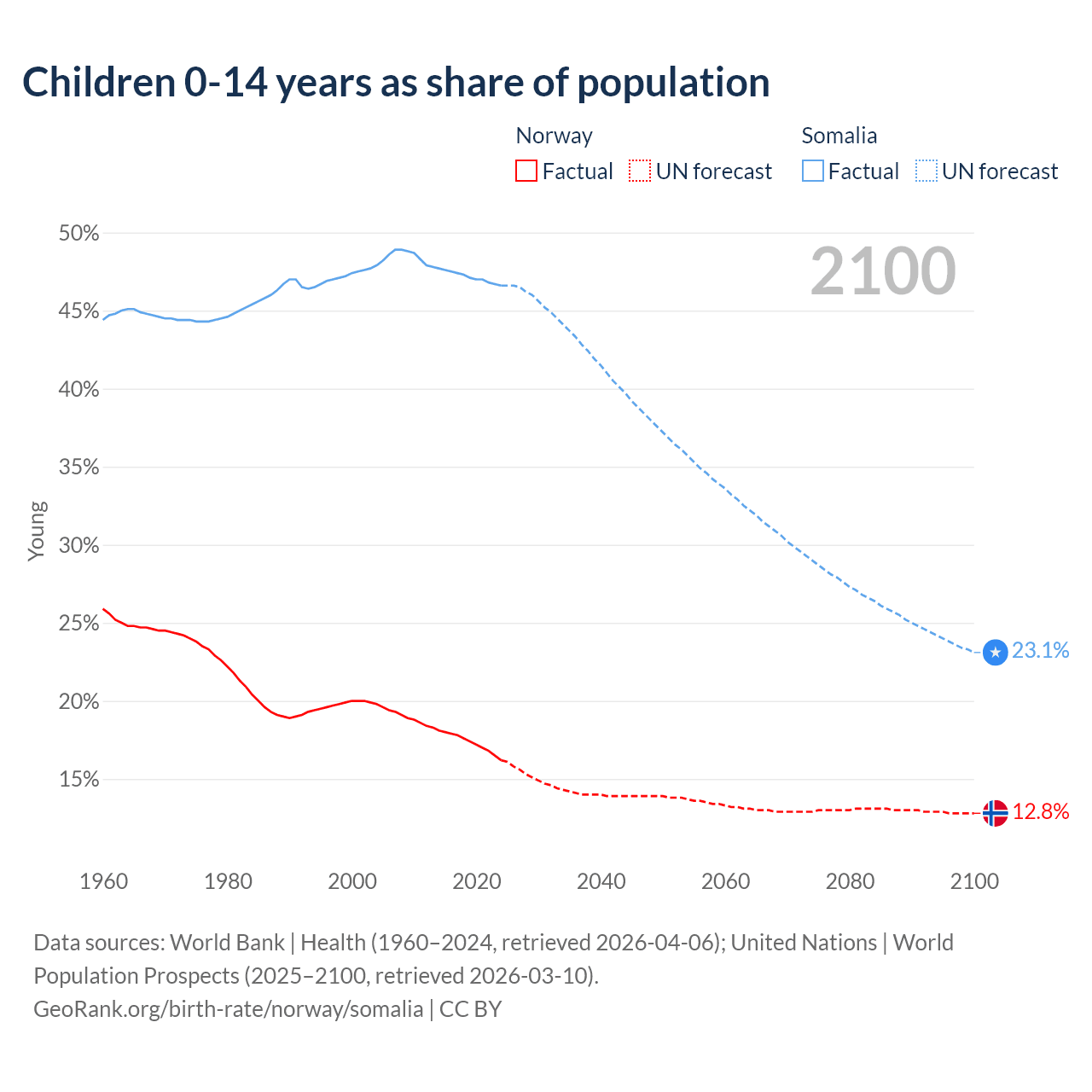 According to the latest available data on birth rates, the fertility rate in Norway was 1.4 children per woman in 2023, compared to 6.13 in Somalia in 2023. The replacement level is considered to be 2.1 children per woman.