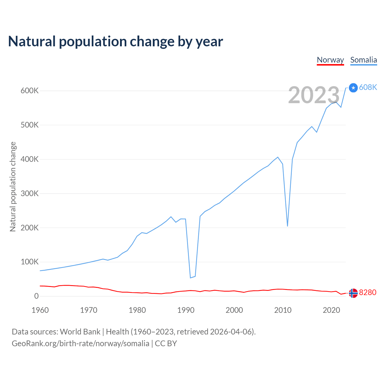 Norway has an annual birth rate of 9.4 births per 1,000 people, compared to 43 for Somalia. The average number of children a woman is expected to have during her lifetime — the fertility rate, is 1.4 in Norway and 6.13 in Somalia — 338% difference.