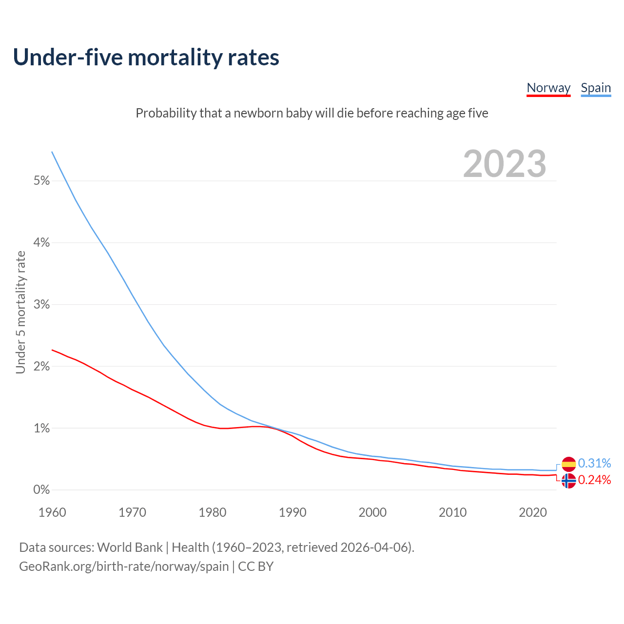 The chance that a newborn baby will die before reaching age five is 0.24% in Norway and 0.31% in Spain. Above is a chart with historical data on under-five mortality rates.