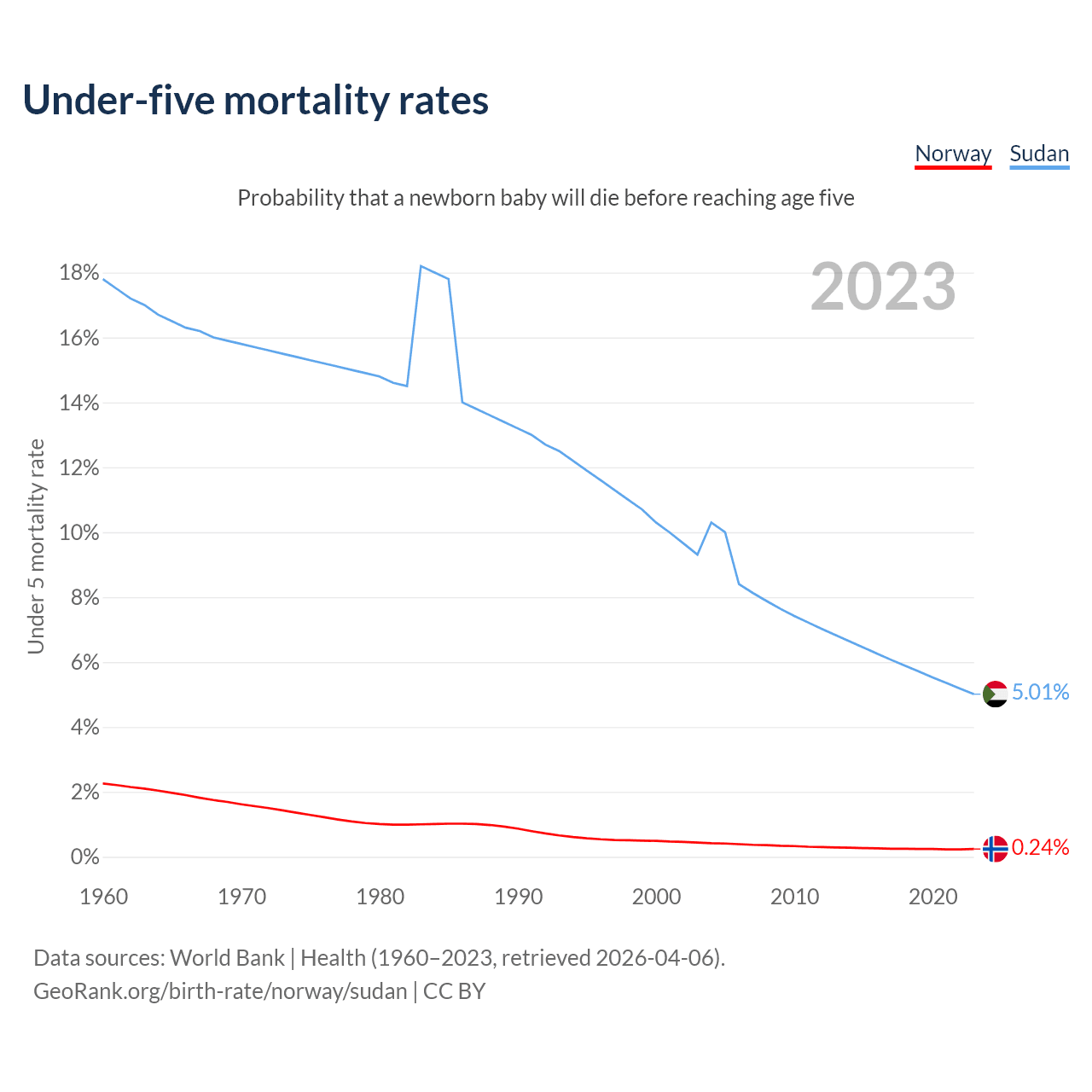 The chance that a newborn baby will die before reaching age five is 0.24% in Norway and 5.01% in Sudan. Above is a chart with historical data on under-five mortality rates.