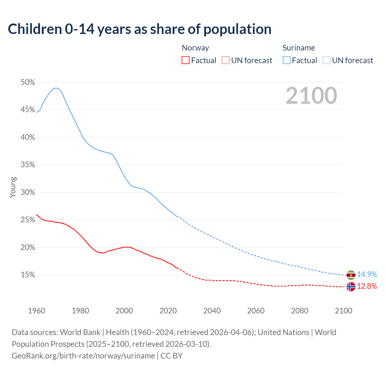 According to the latest available data on birth rates, the fertility rate in Norway was 1.4 children per woman in 2023, compared to 2.25 in Suriname in 2023. The replacement level is considered to be 2.1 children per woman.