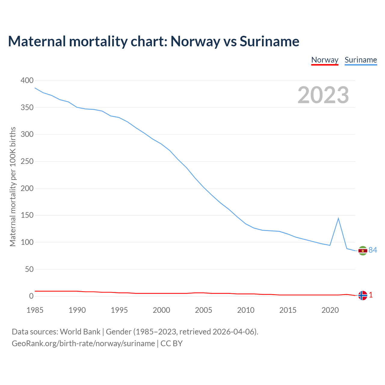 The maternal mortality rate, which is the probability of dying during childbirth or within 42 days of pregnancy termination, is 1 deaths per 100,000 live births in Norway, compared to 84 deaths in Suriname.