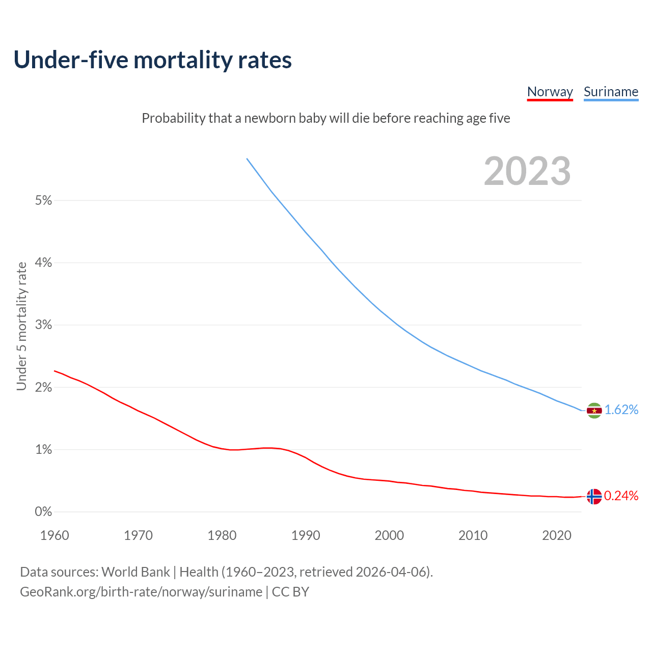 The chance that a newborn baby will die before reaching age five is 0.24% in Norway and 1.62% in Suriname. Above is a chart with historical data on under-five mortality rates.