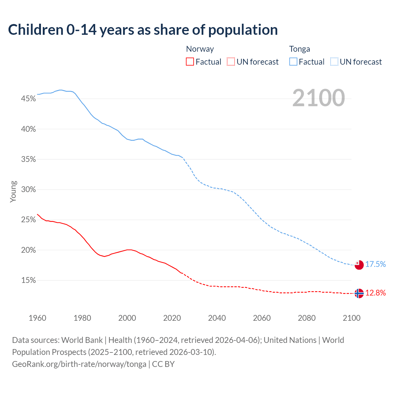 According to the latest available data on birth rates, the fertility rate in Norway was 1.4 children per woman in 2023, compared to 3.13 in Tonga in 2023. The replacement level is considered to be 2.1 children per woman.