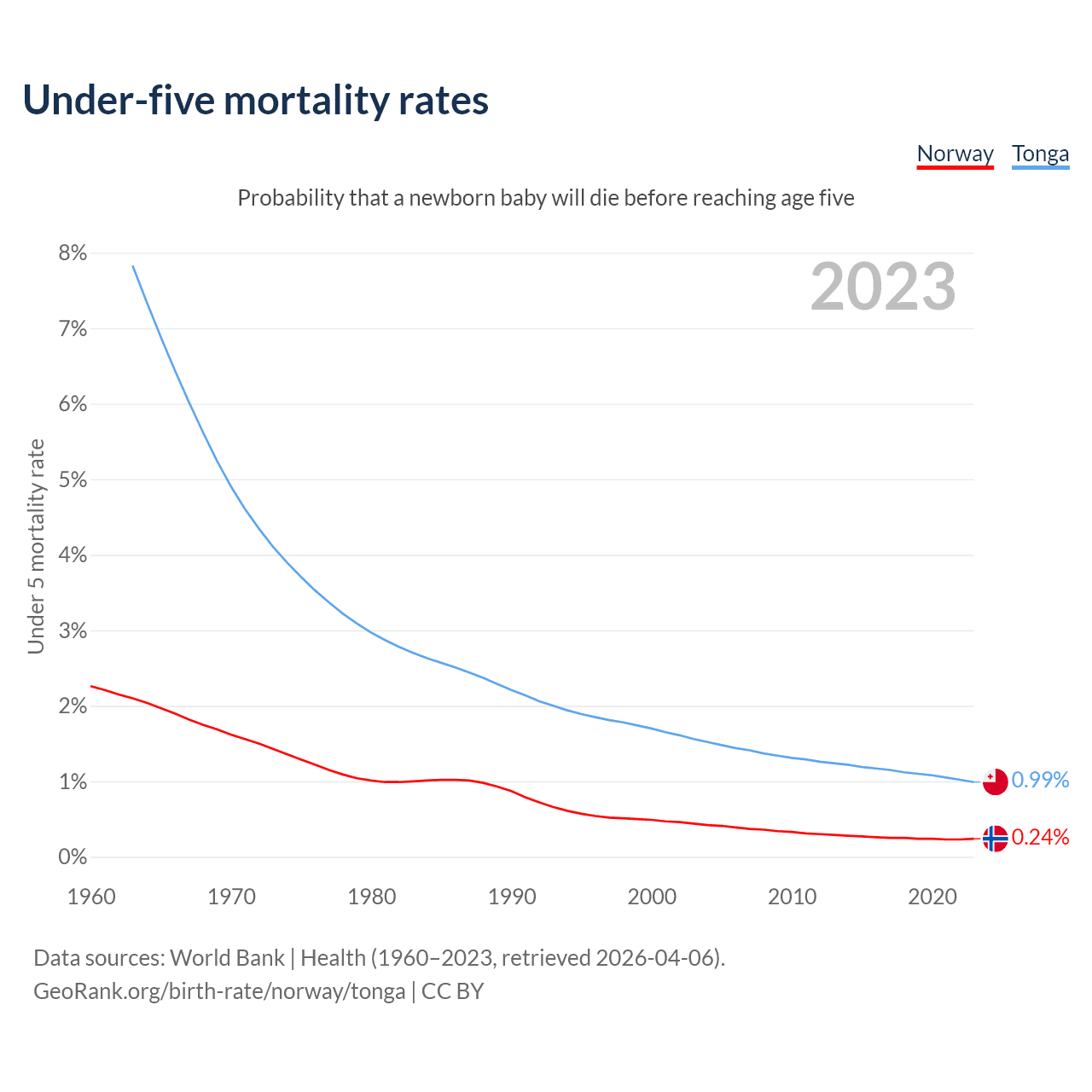 The chance that a newborn baby will die before reaching age five is 0.24% in Norway and 0.99% in Tonga. Above is a chart with historical data on under-five mortality rates.