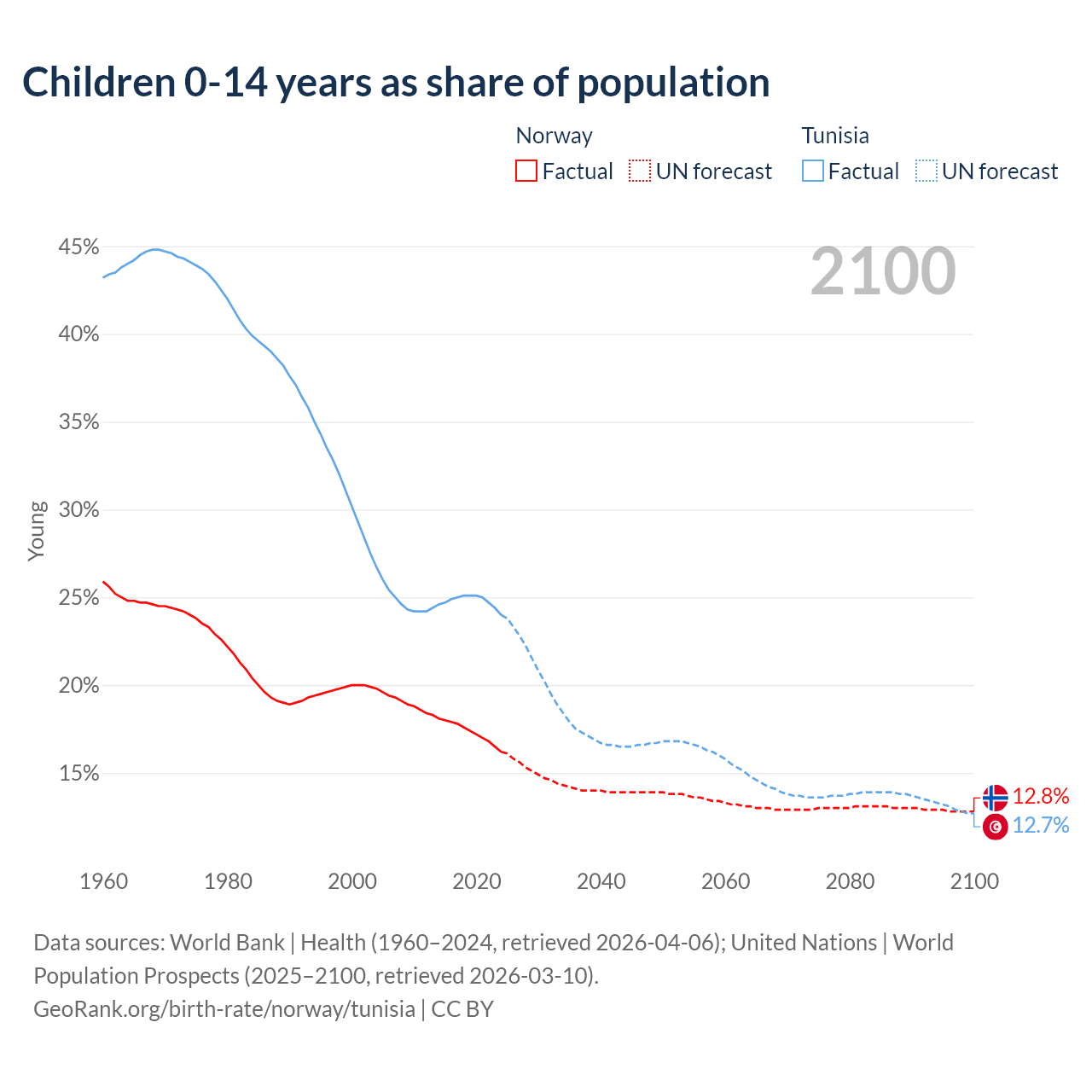 According to the latest available data on birth rates, the fertility rate in Norway was 1.4 children per woman in 2023, compared to 1.83 in Tunisia in 2023. The replacement level is considered to be 2.1 children per woman.