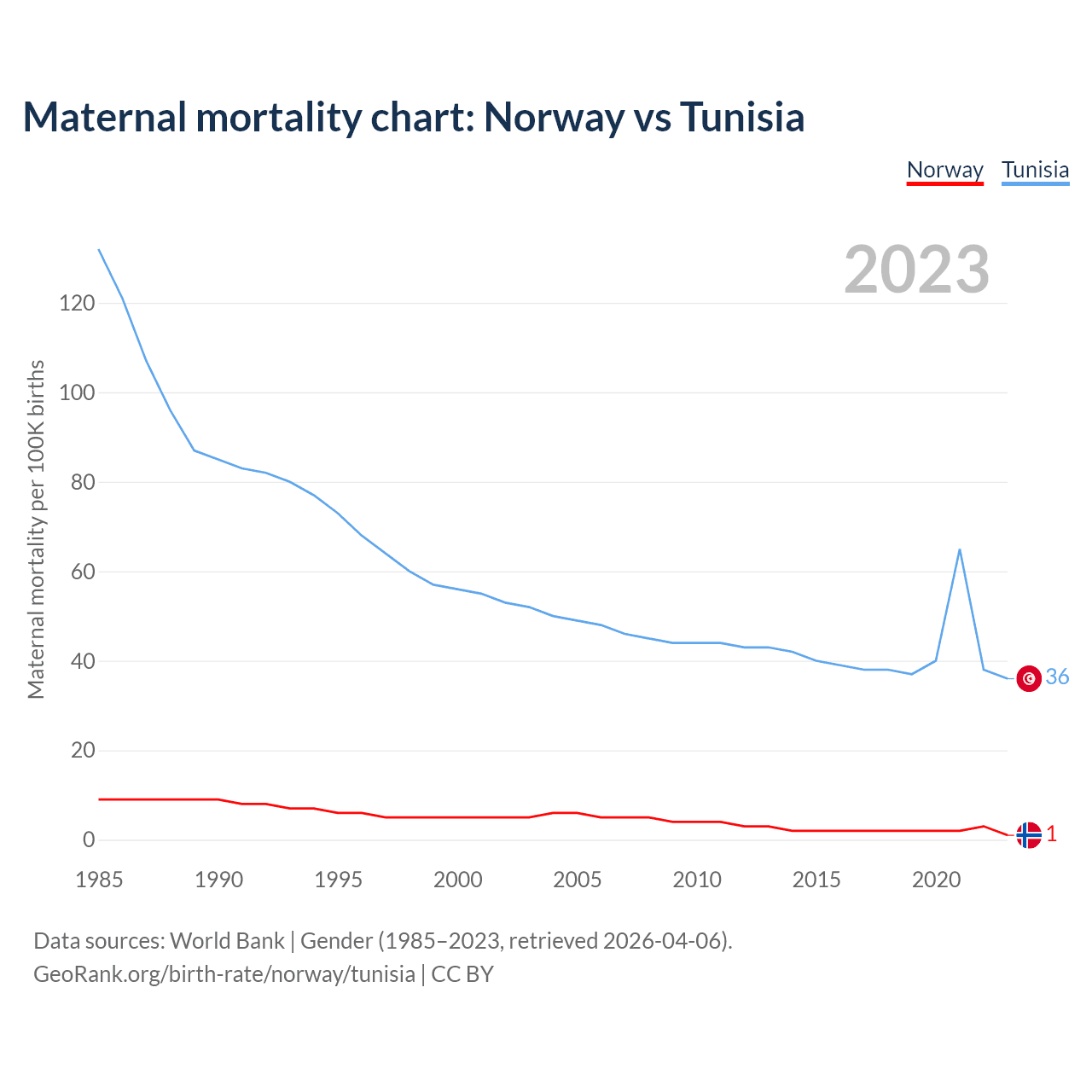 The maternal mortality rate, which is the probability of dying during childbirth or within 42 days of pregnancy termination, is 1 deaths per 100,000 live births in Norway, compared to 36 deaths in Tunisia.