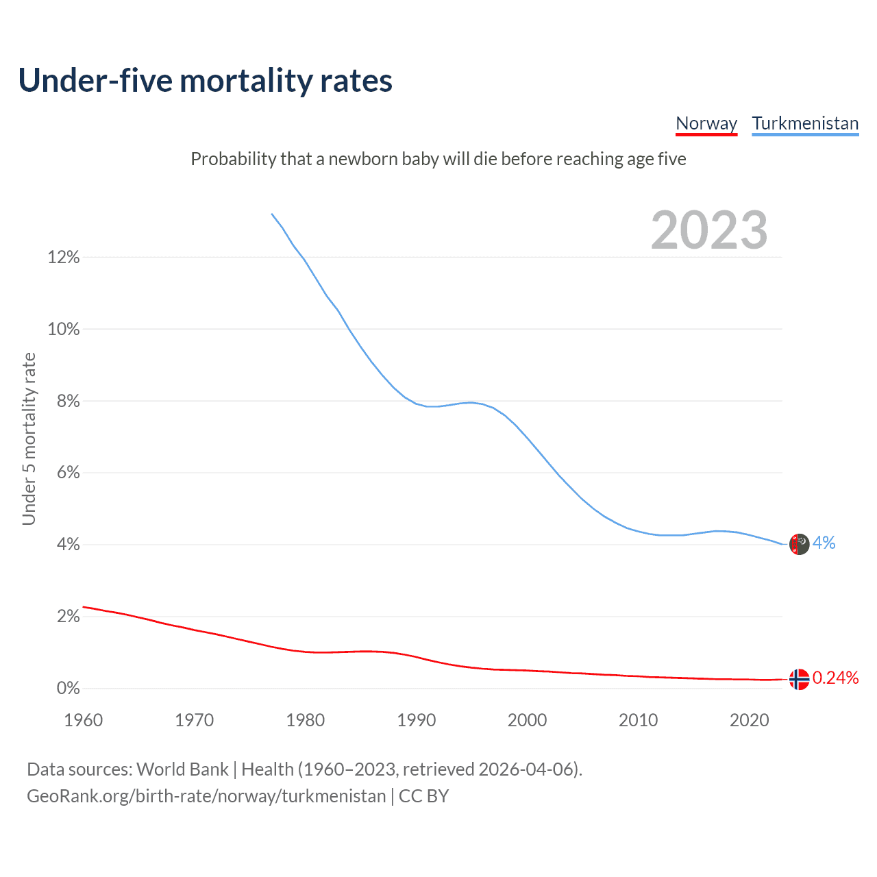 The chance that a newborn baby will die before reaching age five is 0.24% in Norway and 4% in Turkmenistan. Above is a chart with historical data on under-five mortality rates.