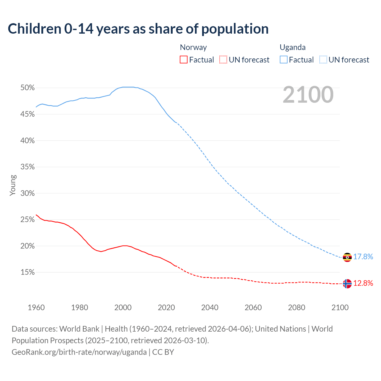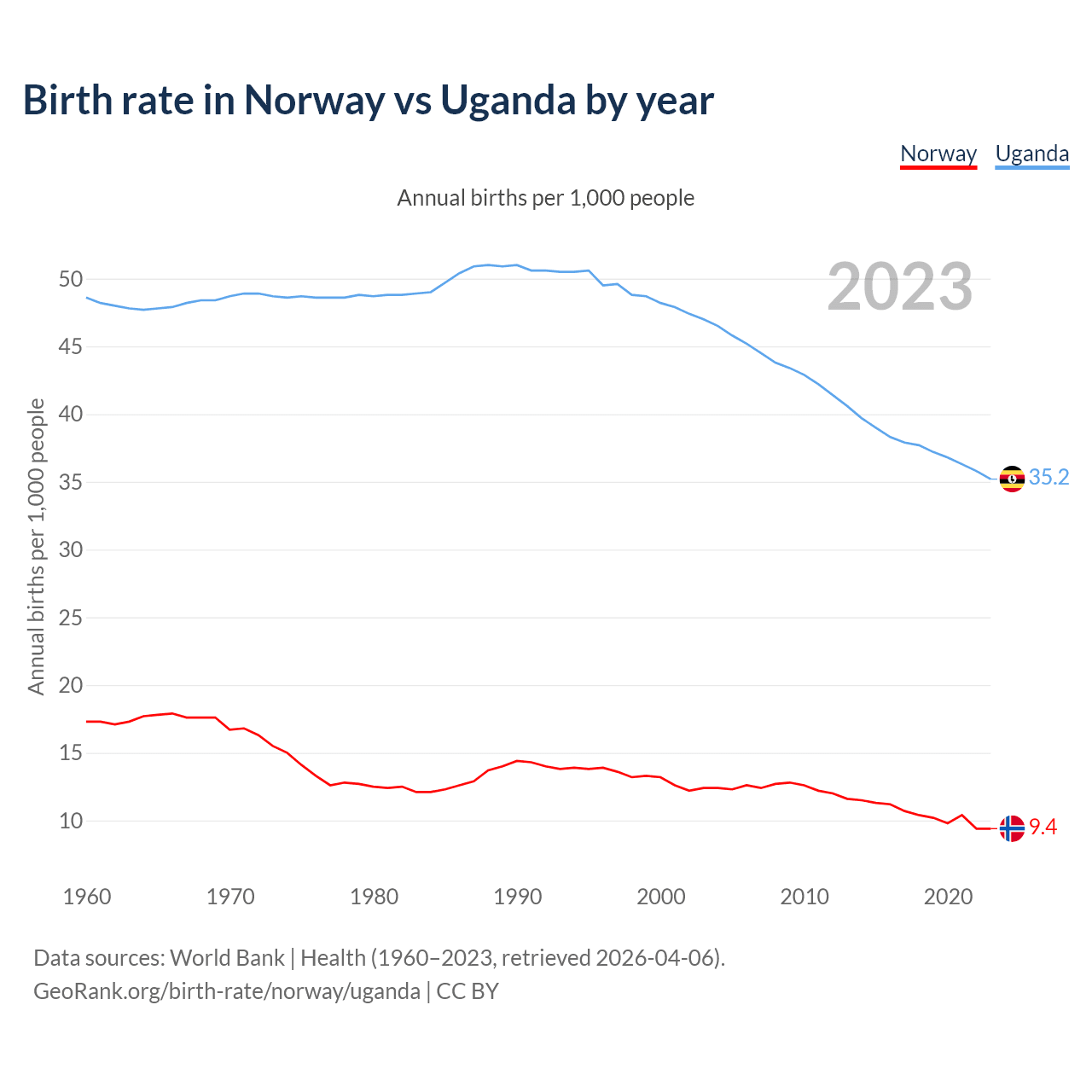 According to the latest available data on birth rates, the fertility rate in Norway was 1.4 children per woman in 2023, compared to 4.28 in Uganda in 2023. The replacement level is considered to be 2.1 children per woman.