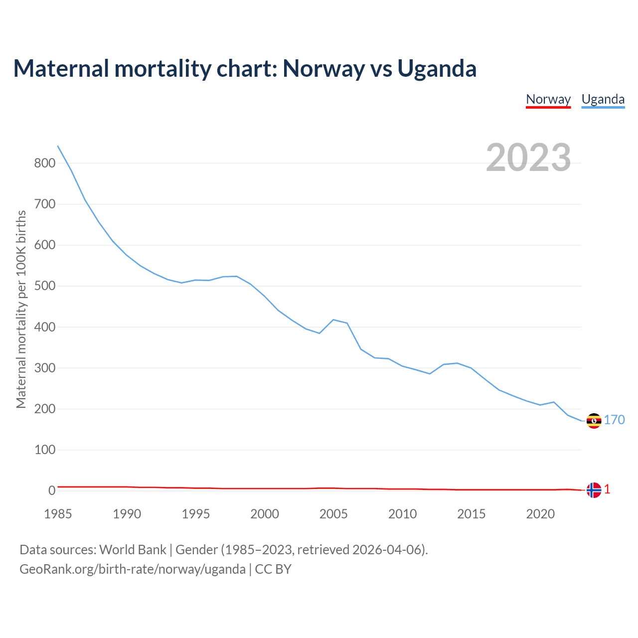 The maternal mortality rate, which is the probability of dying during childbirth or within 42 days of pregnancy termination, is 1 deaths per 100,000 live births in Norway, compared to 170 deaths in Uganda.
