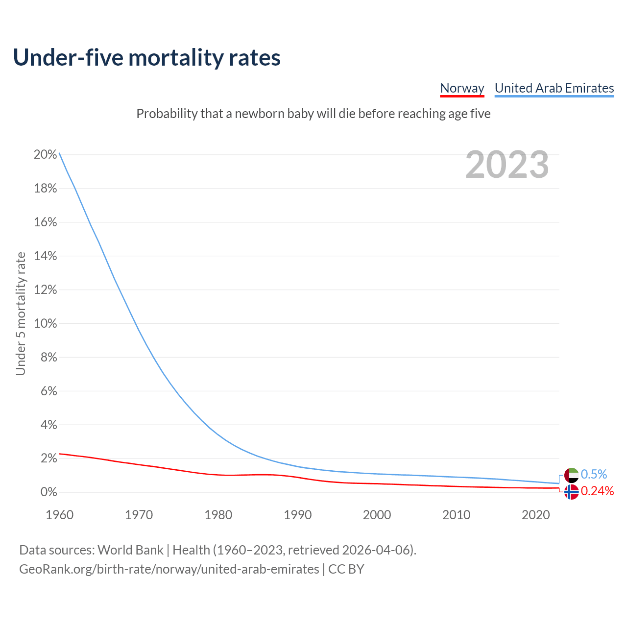 The chance that a newborn baby will die before reaching age five is 0.24% in Norway and 0.5% in the United Arab Emirates. Above is a chart with historical data on under-five mortality rates.