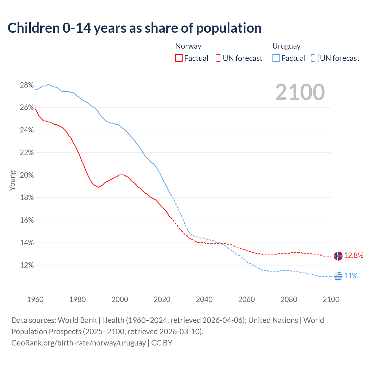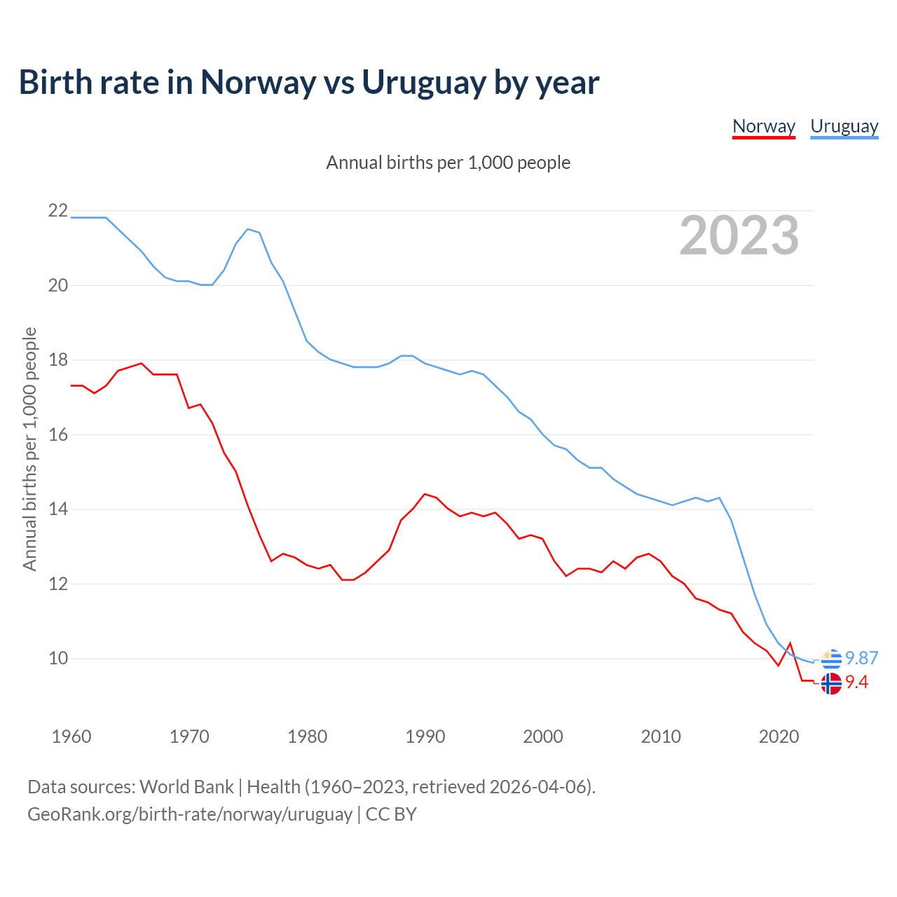 Norway has an annual birth rate of 9.4 births per 1,000 people, compared to 9.87 for Uruguay. The average number of children a woman is expected to have during her lifetime — the fertility rate, is 1.4 in Norway and 1.41 in Uruguay — 0.64% difference.