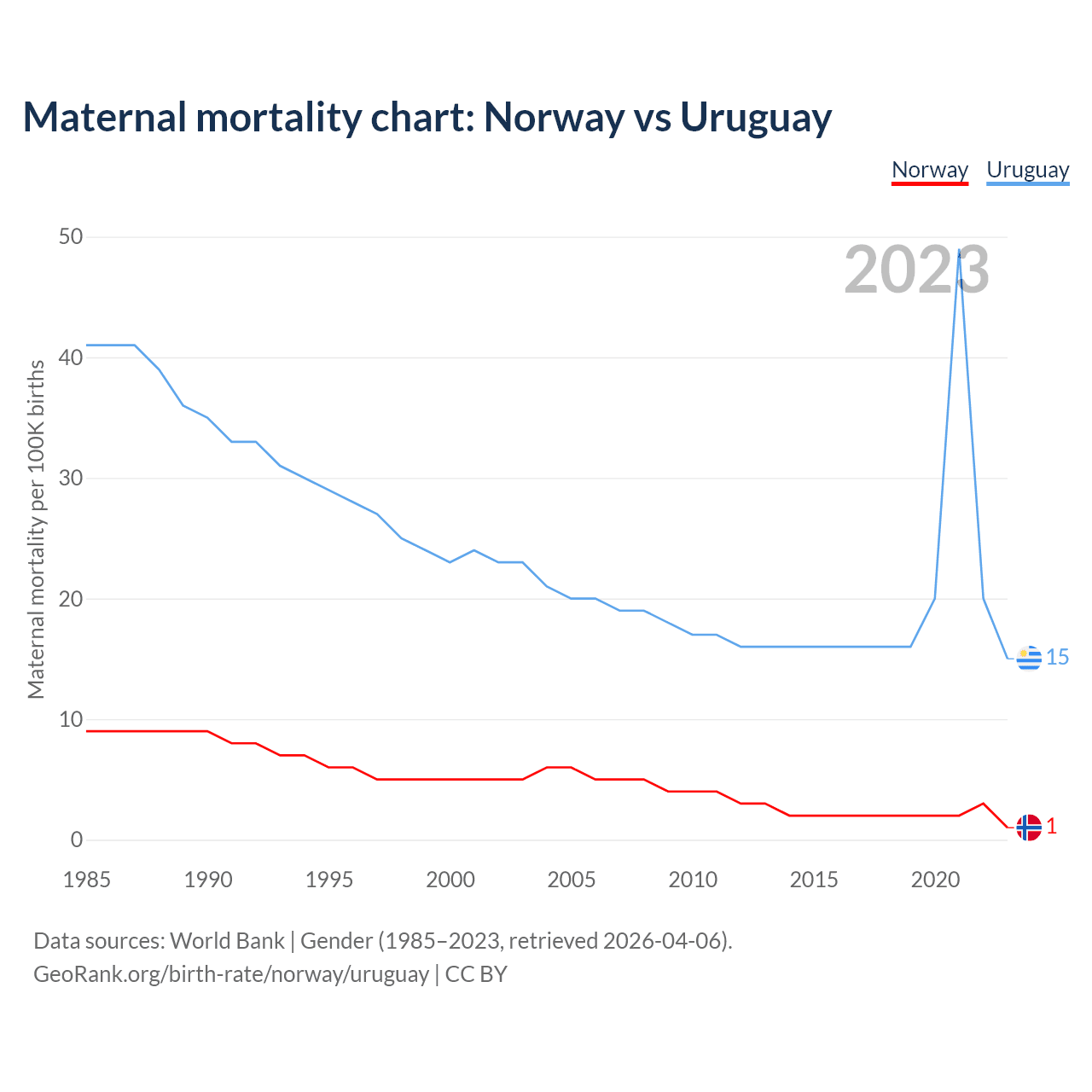 The maternal mortality rate, which is the probability of dying during childbirth or within 42 days of pregnancy termination, is 1 deaths per 100,000 live births in Norway, compared to 15 deaths in Uruguay.