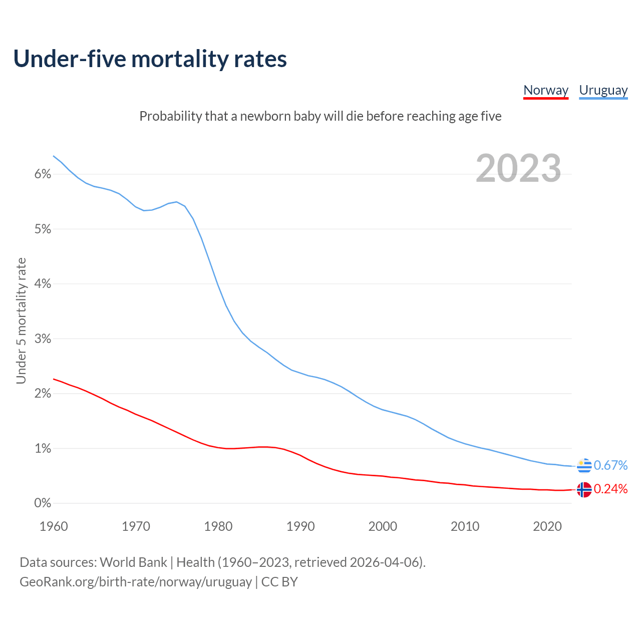 The chance that a newborn baby will die before reaching age five is 0.24% in Norway and 0.67% in Uruguay. Above is a chart with historical data on under-five mortality rates.