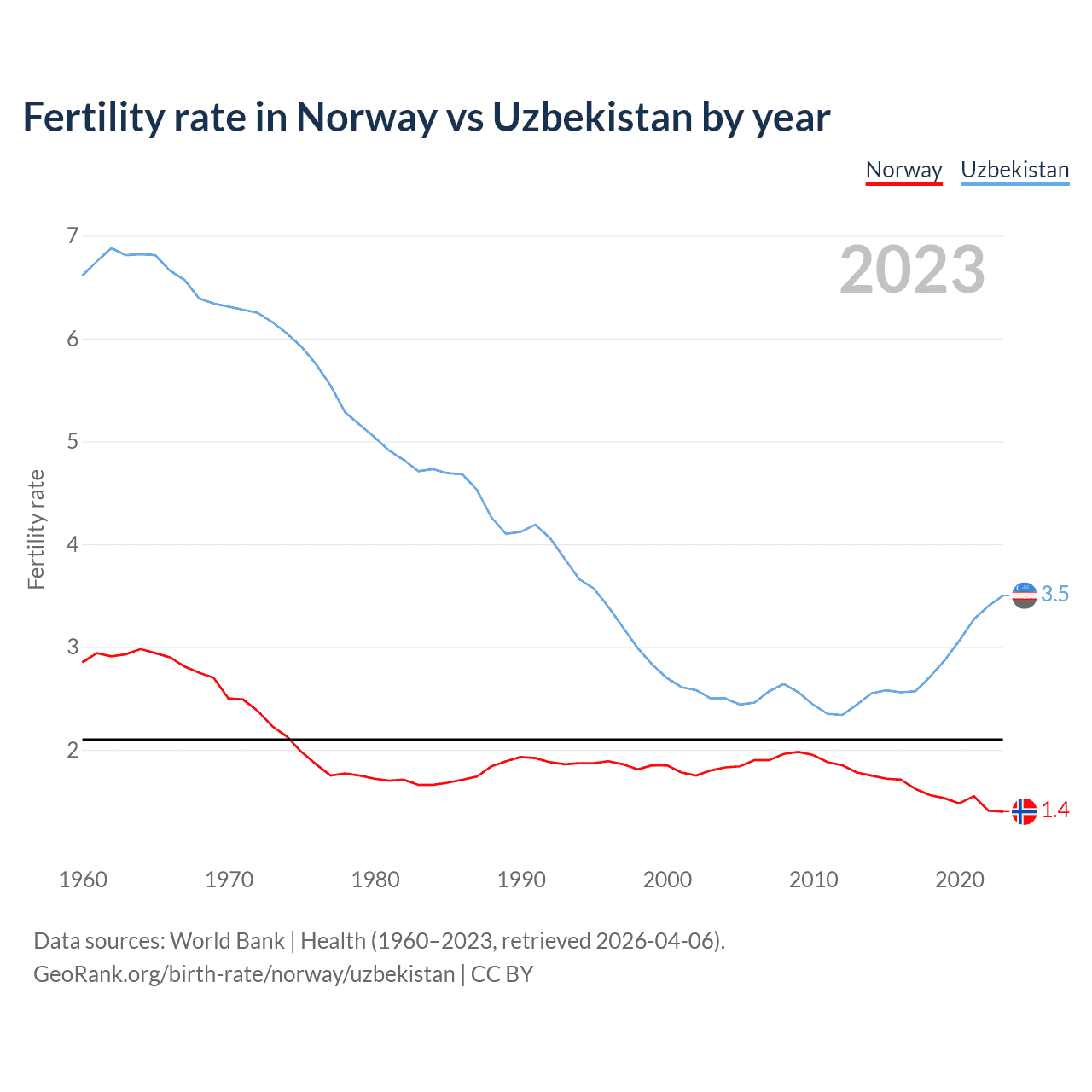 According to the latest available data on birth rates, the fertility rate in Norway was 1.4 children per woman in 2023, compared to 3.5 in Uzbekistan in 2023. The replacement level is considered to be 2.1 children per woman.