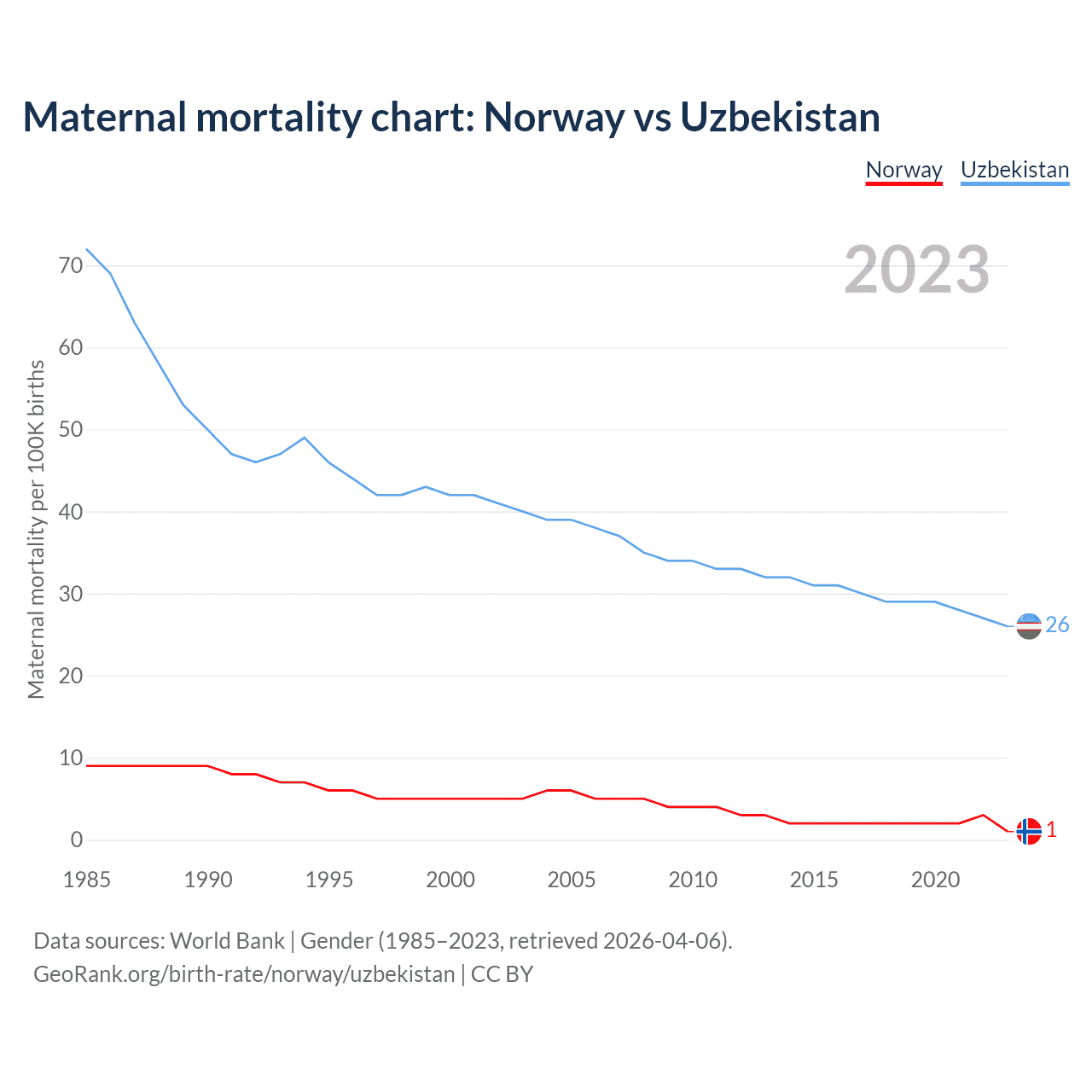 The maternal mortality rate, which is the probability of dying during childbirth or within 42 days of pregnancy termination, is 1 deaths per 100,000 live births in Norway, compared to 26 deaths in Uzbekistan.