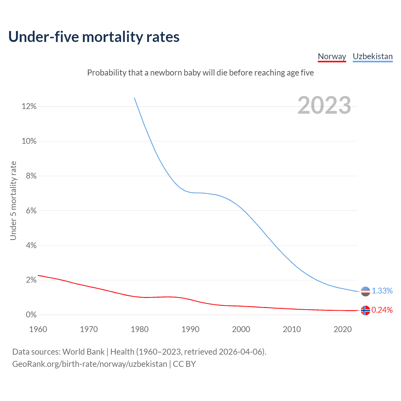 The chance that a newborn baby will die before reaching age five is 0.24% in Norway and 1.33% in Uzbekistan. Above is a chart with historical data on under-five mortality rates.
