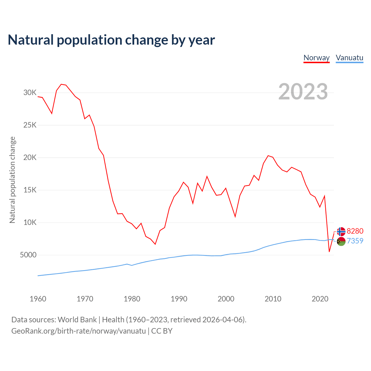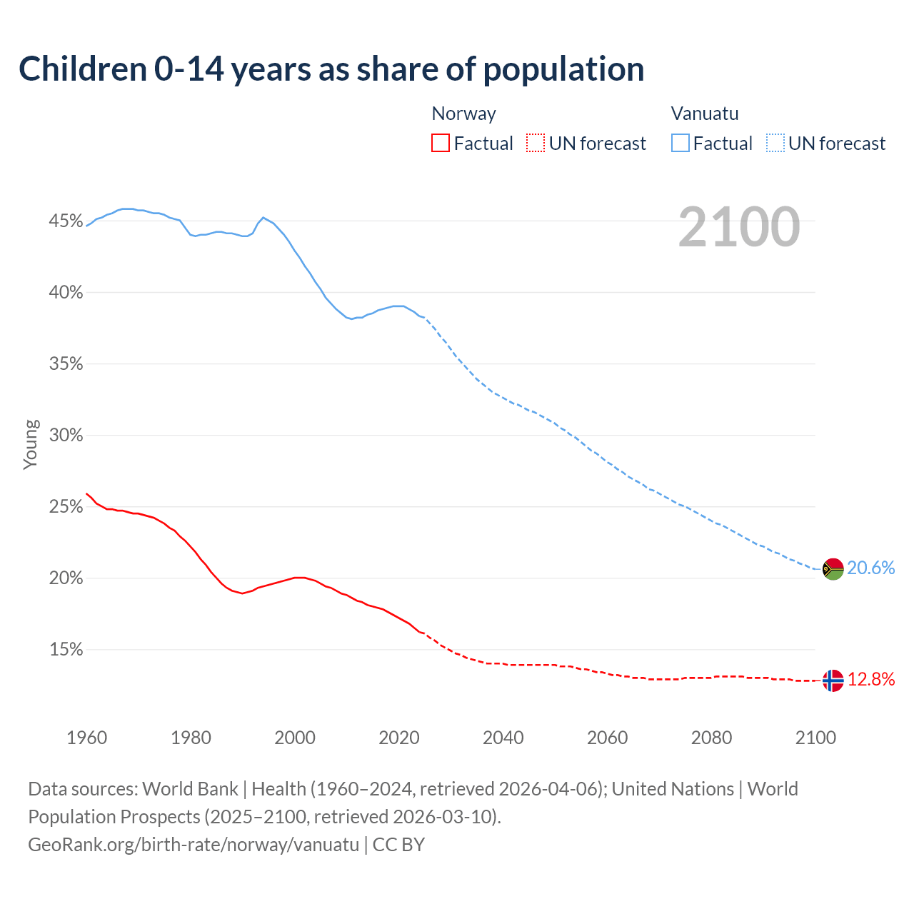 Norway has an annual birth rate of 9.4 births per 1,000 people, compared to 28.1 for Vanuatu. The average number of children a woman is expected to have during her lifetime — the fertility rate, is 1.4 in Norway and 3.6 in Vanuatu — 156.9% difference.