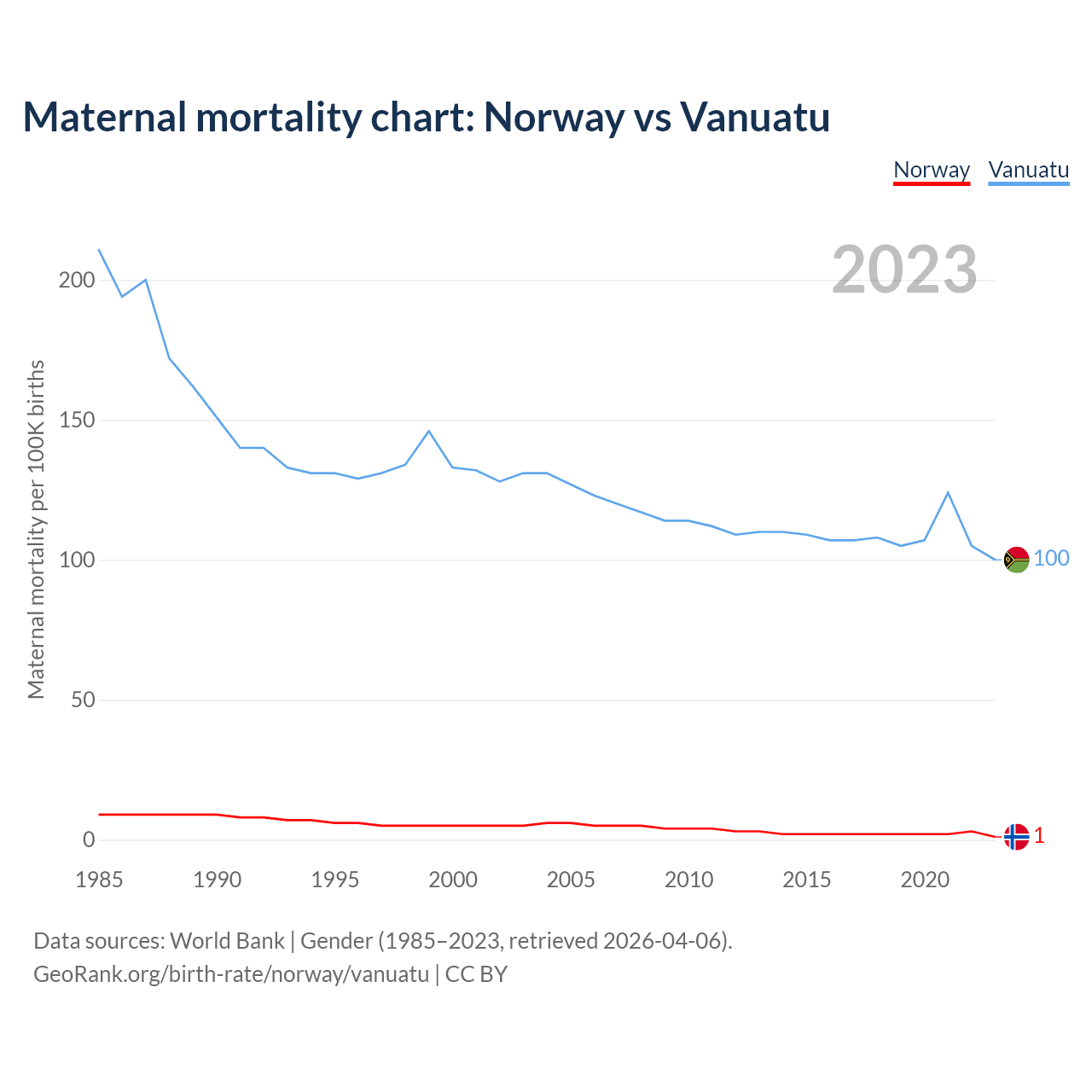 The maternal mortality rate, which is the probability of dying during childbirth or within 42 days of pregnancy termination, is 1 deaths per 100,000 live births in Norway, compared to 100 deaths in Vanuatu.