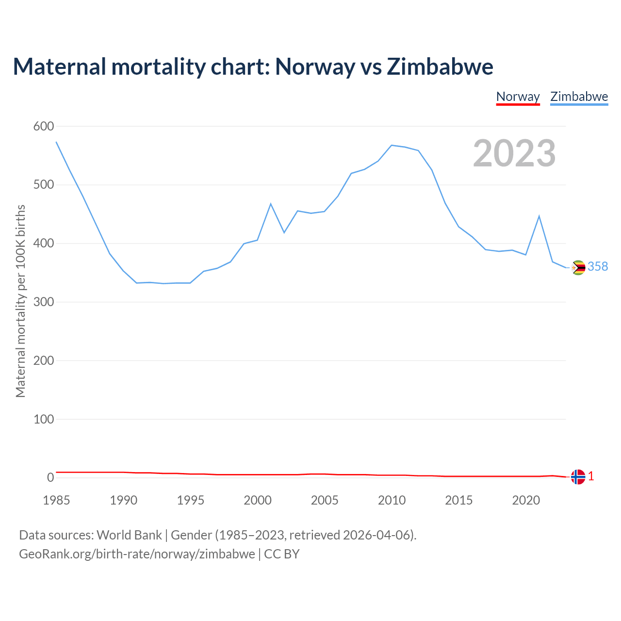 The maternal mortality rate, which is the probability of dying during childbirth or within 42 days of pregnancy termination, is 1 deaths per 100,000 live births in Norway, compared to 358 deaths in Zimbabwe.