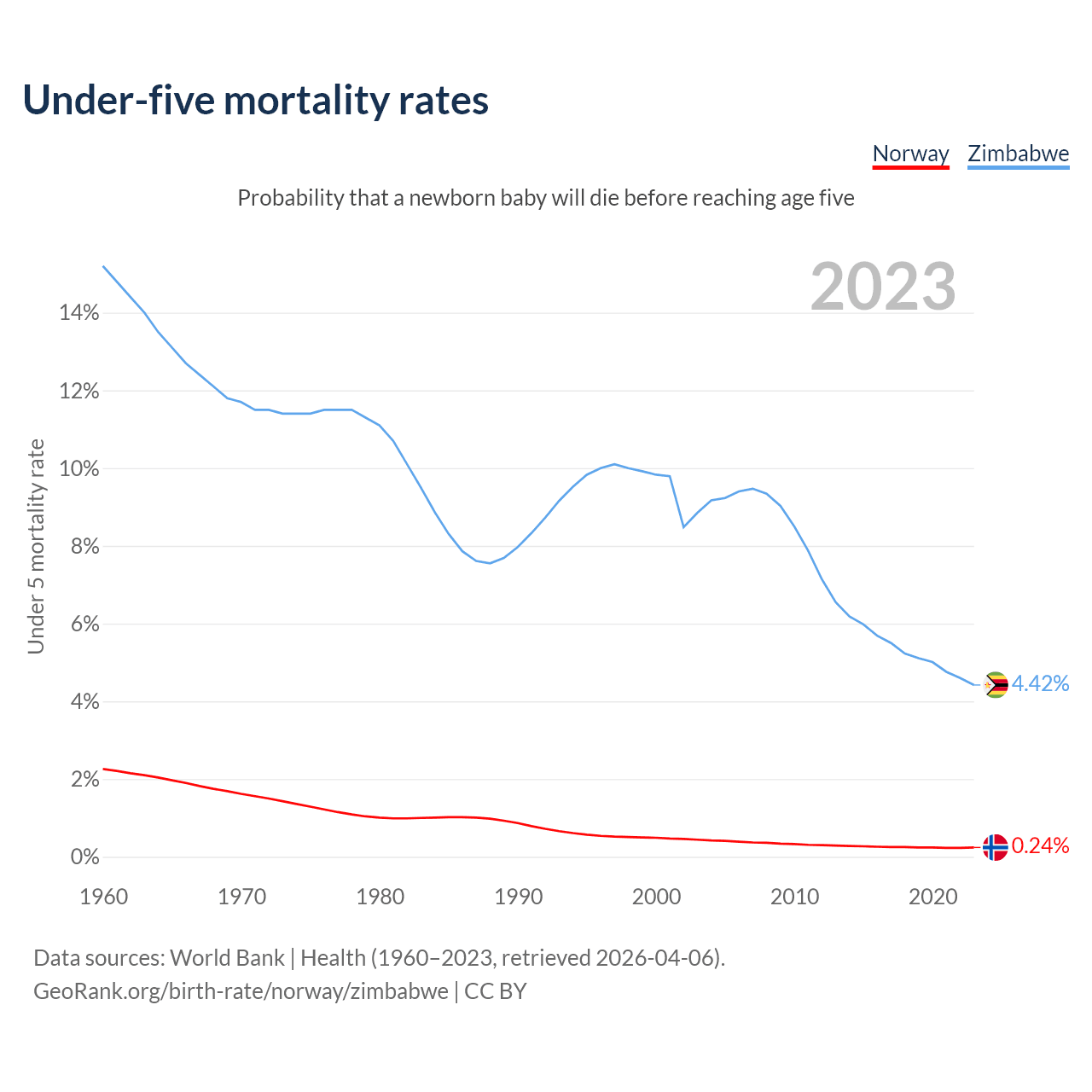 The chance that a newborn baby will die before reaching age five is 0.24% in Norway and 4.42% in Zimbabwe. Above is a chart with historical data on under-five mortality rates.