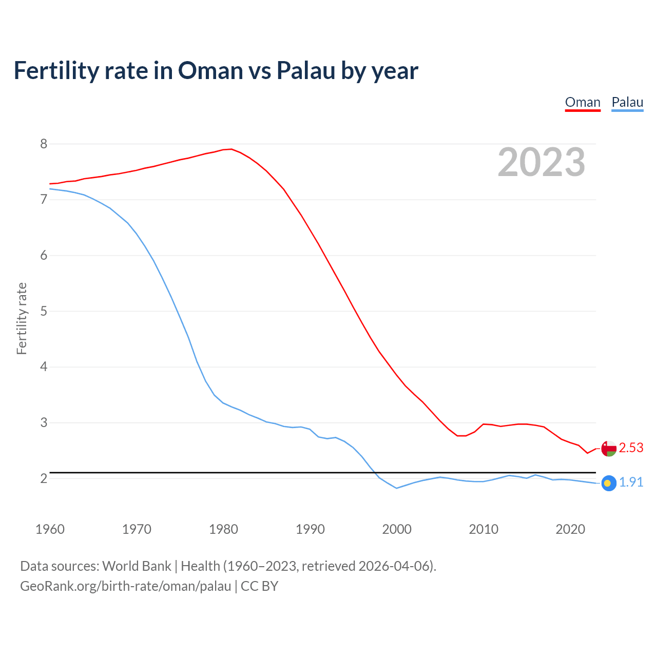According to the latest available data on birth rates, the fertility rate in Oman was 2.53 children per woman in 2023, compared to 1.91 in Palau in 2023. The replacement level is considered to be 2.1 children per woman.