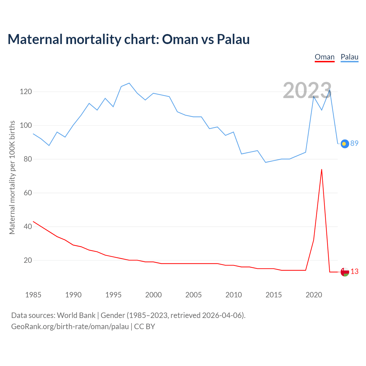 The maternal mortality rate, which is the probability of dying during childbirth or within 42 days of pregnancy termination, is 13 deaths per 100,000 live births in Oman, compared to 89 deaths in Palau.