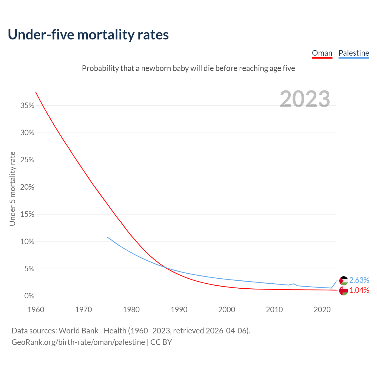 The chance that a newborn baby will die before reaching age five is 1.04% in Oman and 2.63% in Palestine. Above is a chart with historical data on under-five mortality rates.