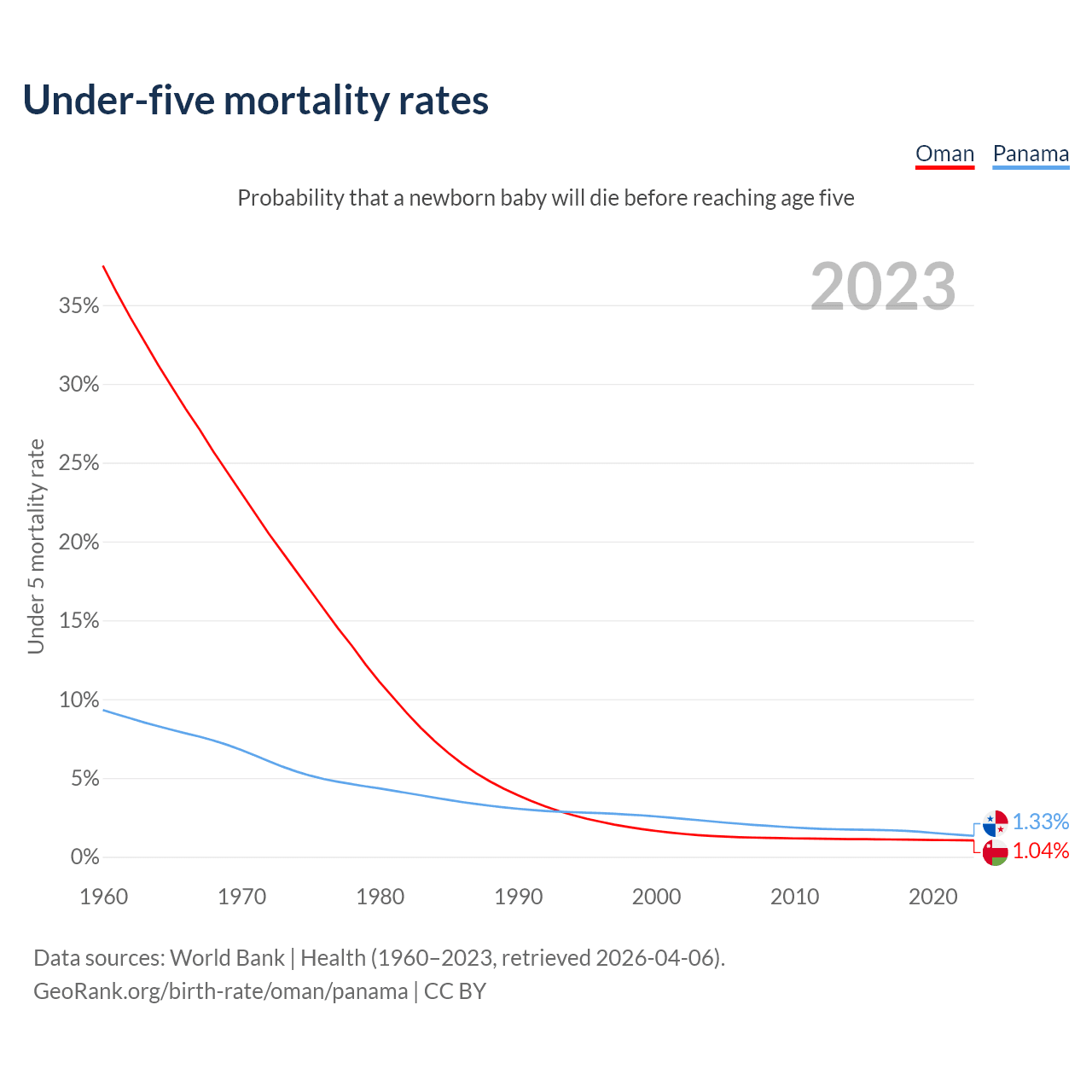 The chance that a newborn baby will die before reaching age five is 1.04% in Oman and 1.33% in Panama. Above is a chart with historical data on under-five mortality rates.