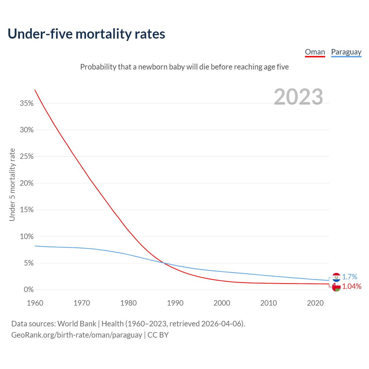 The chance that a newborn baby will die before reaching age five is 1.04% in Oman and 1.7% in Paraguay. Above is a chart with historical data on under-five mortality rates.