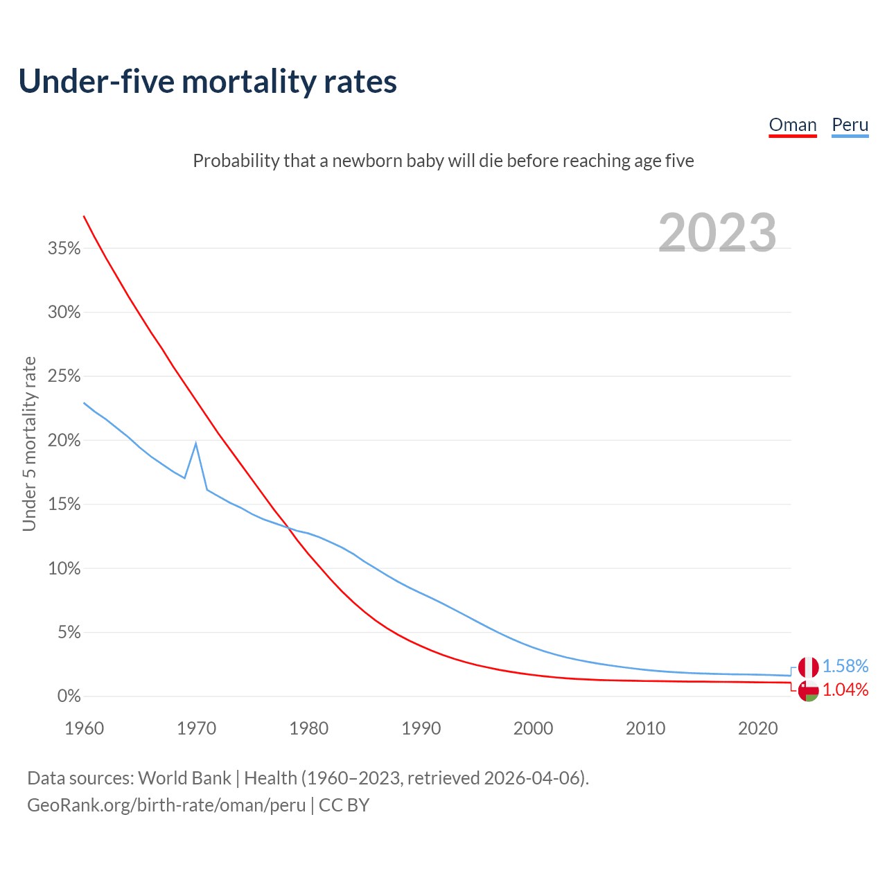 The chance that a newborn baby will die before reaching age five is 1.04% in Oman and 1.58% in Peru. Above is a chart with historical data on under-five mortality rates.