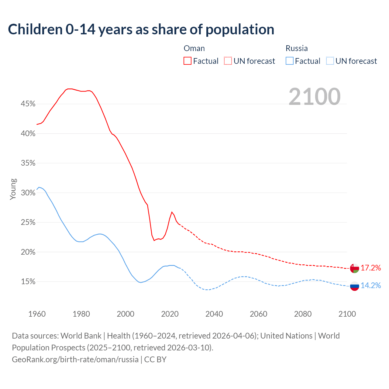 Oman has an annual birth rate of 16.8 births per 1,000 people, compared to 8.6 for Russia. The average number of children a woman is expected to have during her lifetime — the fertility rate, is 2.53 in Oman and 1.41 in Russia — 44.2% difference.