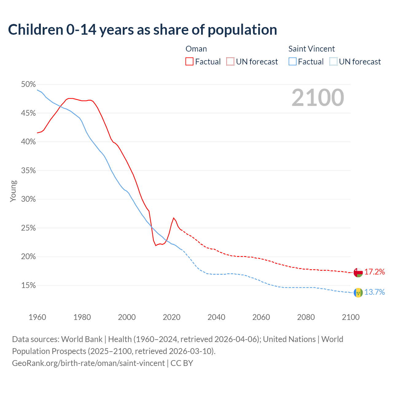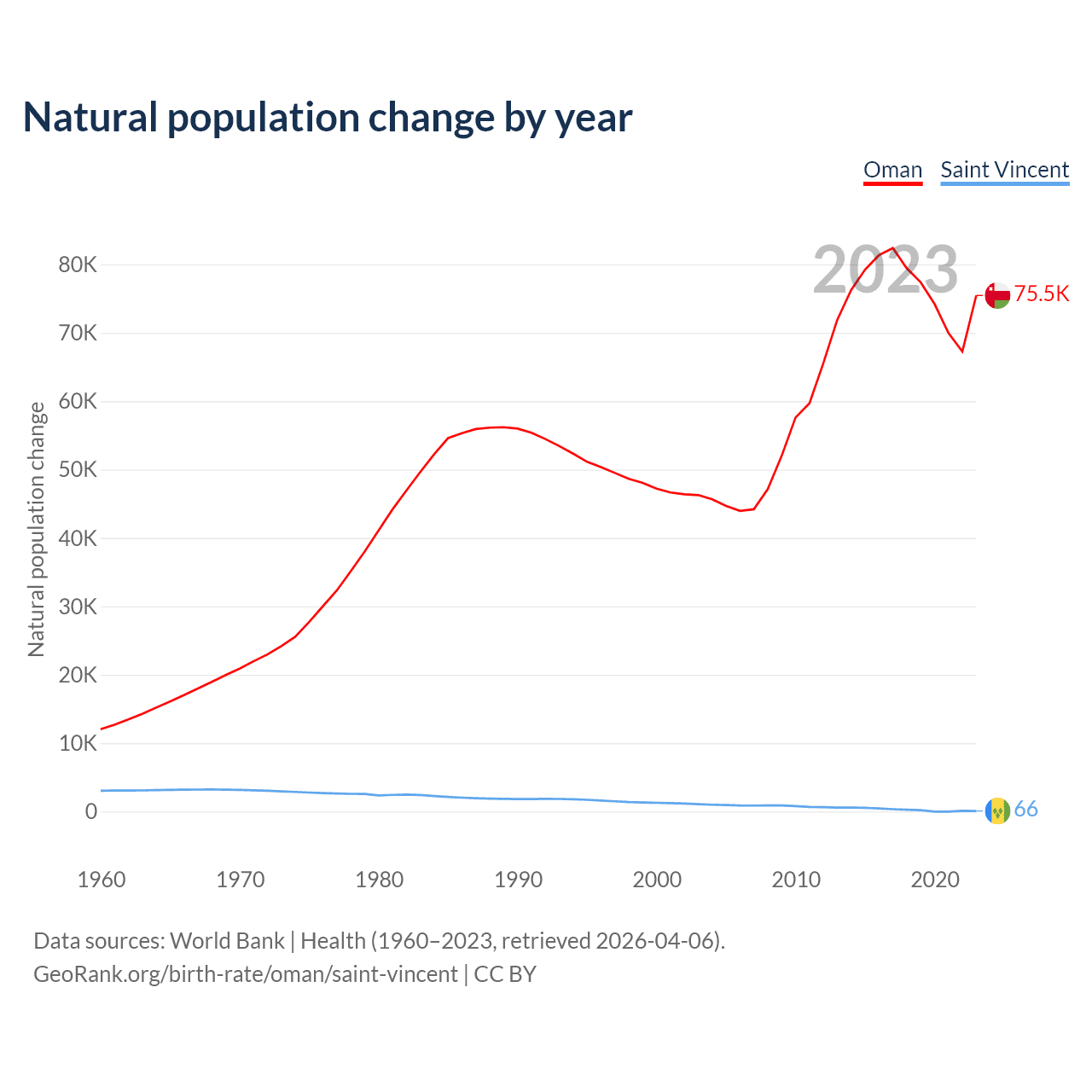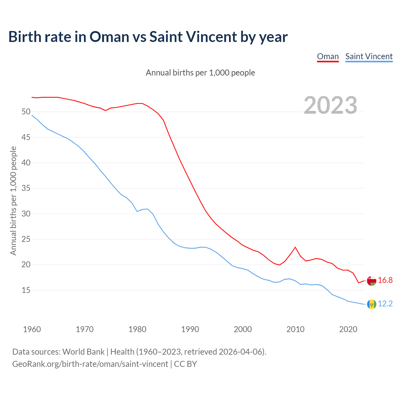 Oman has an annual birth rate of 16.8 births per 1,000 people, compared to 12.2 for Saint Vincent. The average number of children a woman is expected to have during her lifetime — the fertility rate, is 2.53 in Oman and 1.78 in Saint Vincent — 29.7% difference.