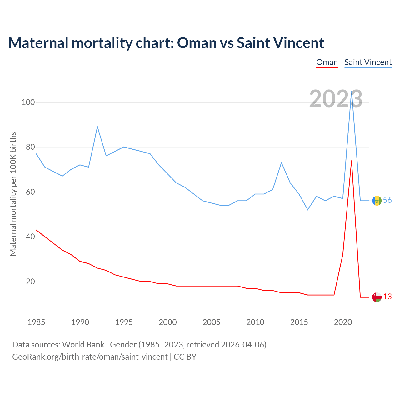 The maternal mortality rate, which is the probability of dying during childbirth or within 42 days of pregnancy termination, is 13 deaths per 100,000 live births in Oman, compared to 56 deaths in Saint Vincent.