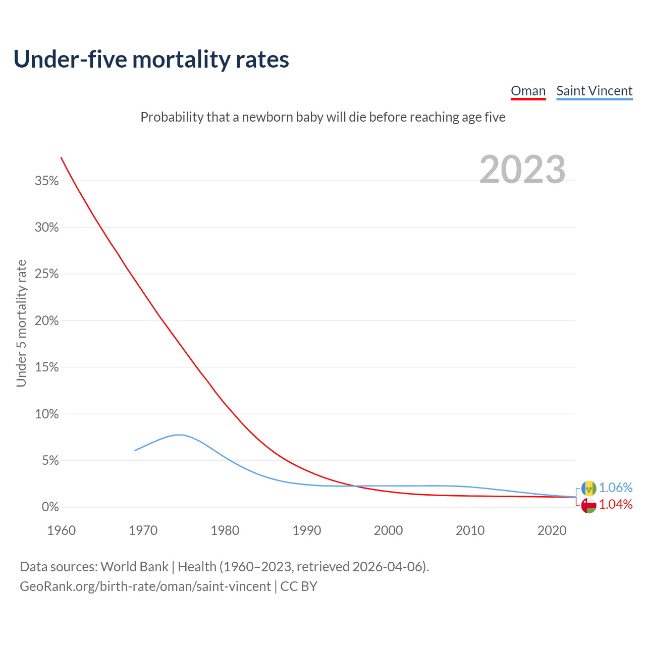 The chance that a newborn baby will die before reaching age five is 1.04% in Oman and 1.06% in Saint Vincent. Above is a chart with historical data on under-five mortality rates.