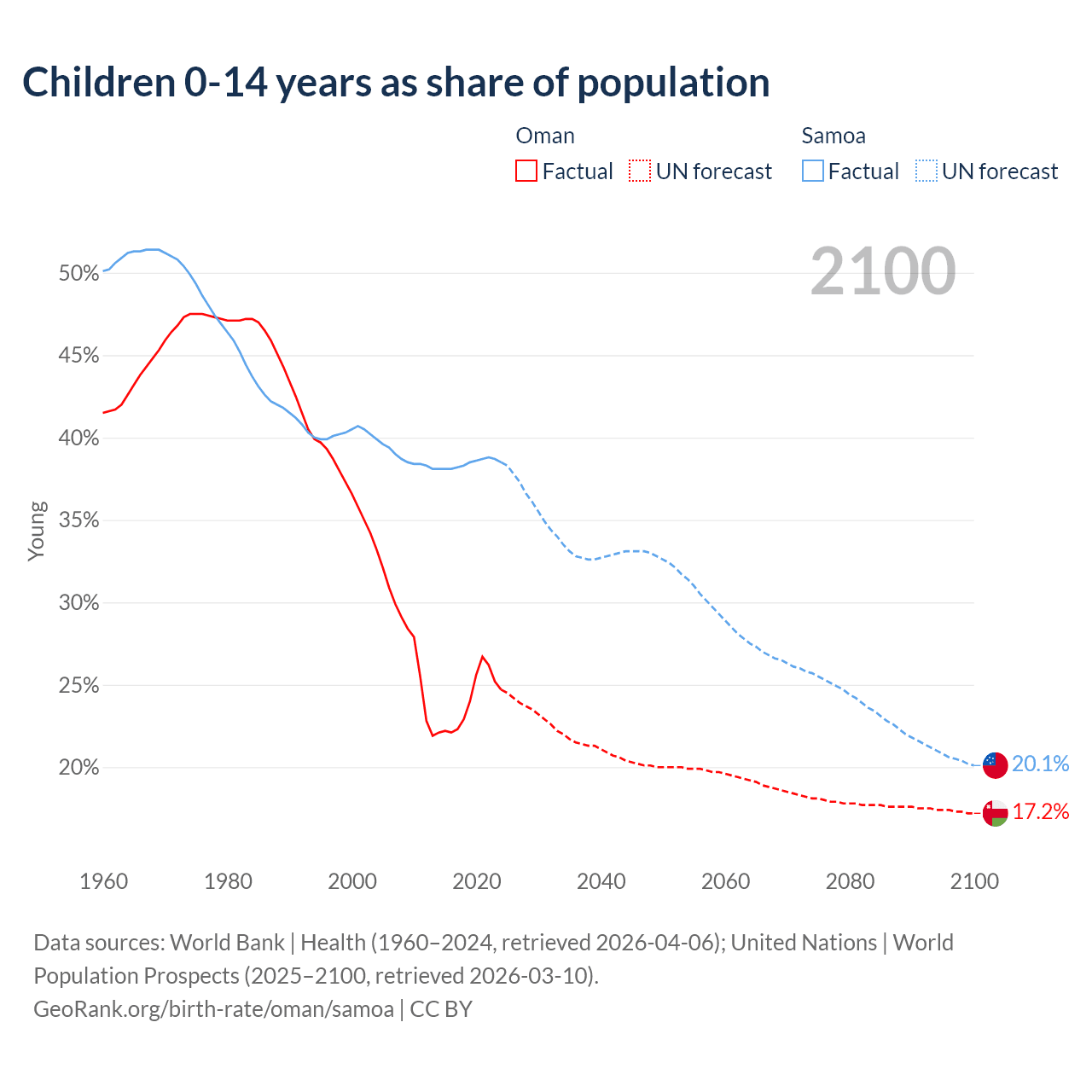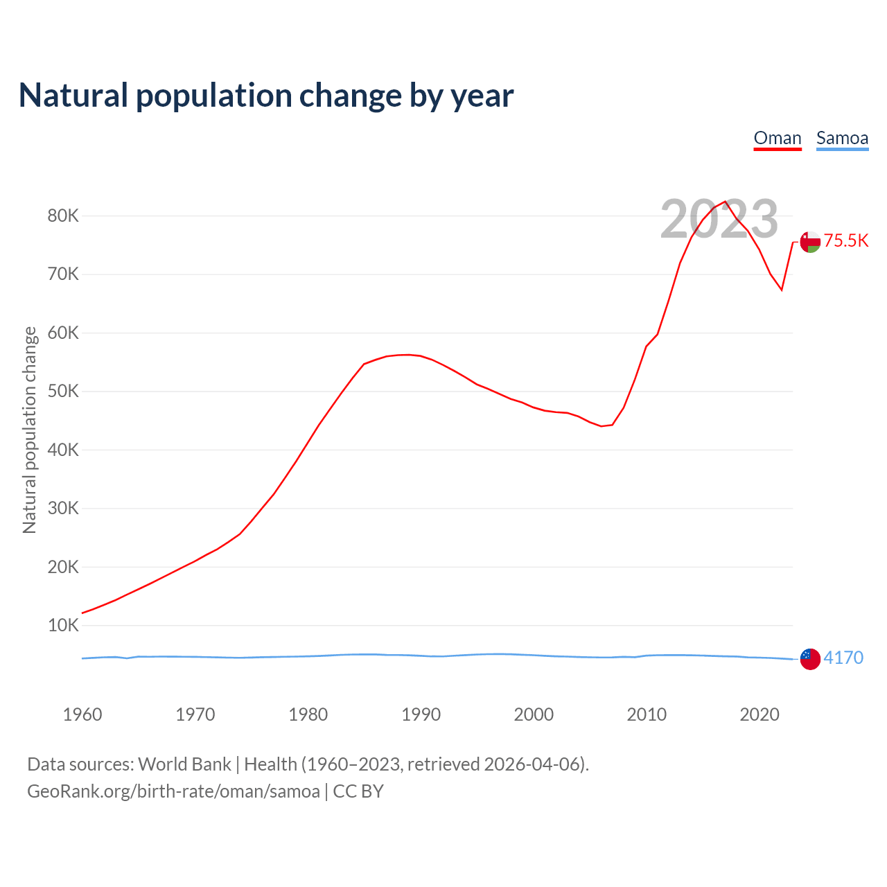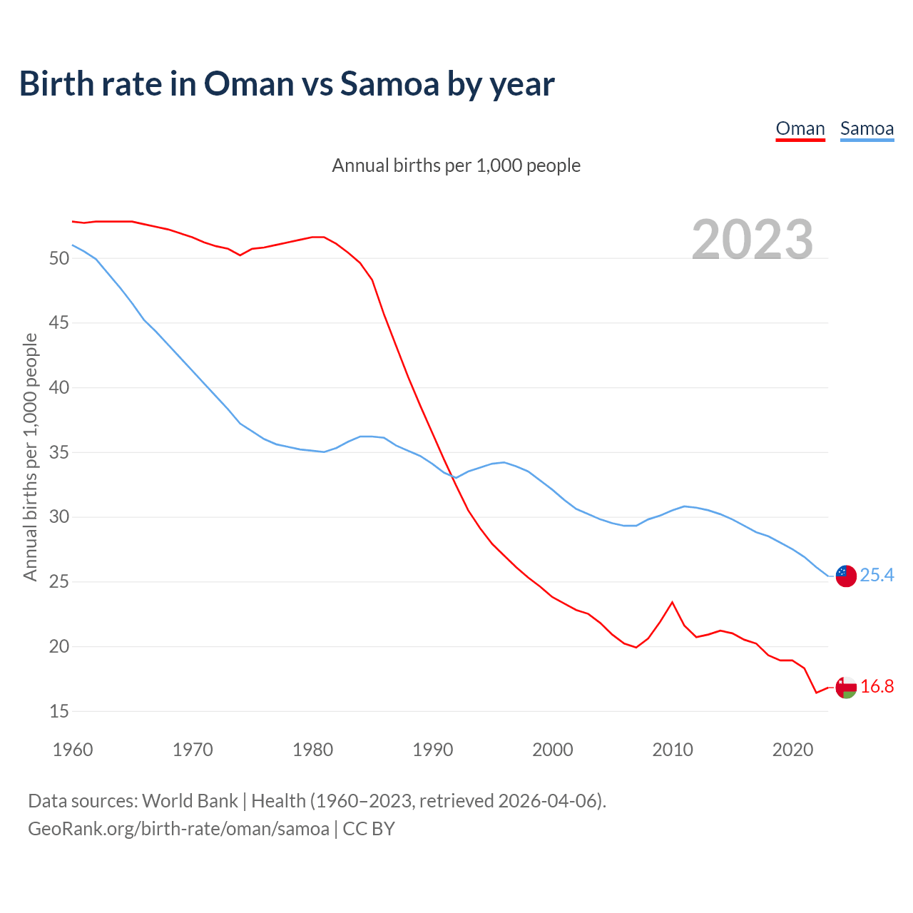 Oman has an annual birth rate of 16.8 births per 1,000 people, compared to 25.4 for Samoa. The average number of children a woman is expected to have during her lifetime — the fertility rate, is 2.53 in Oman and 3.83 in Samoa — 51.6% difference.