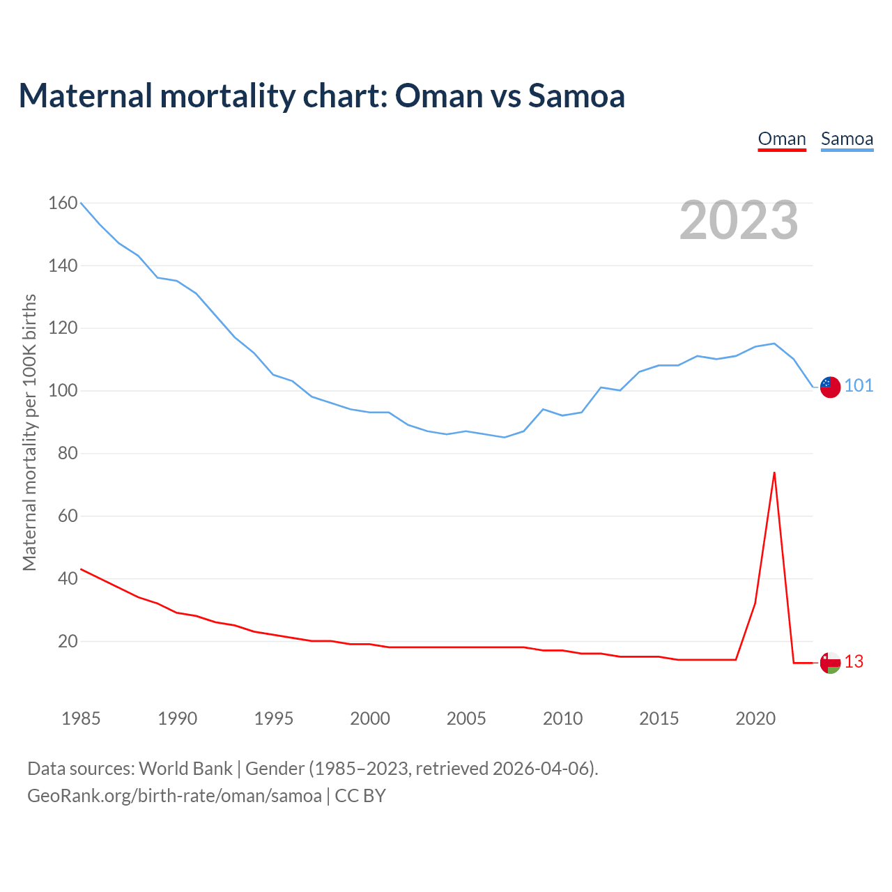 The maternal mortality rate, which is the probability of dying during childbirth or within 42 days of pregnancy termination, is 13 deaths per 100,000 live births in Oman, compared to 101 deaths in Samoa.