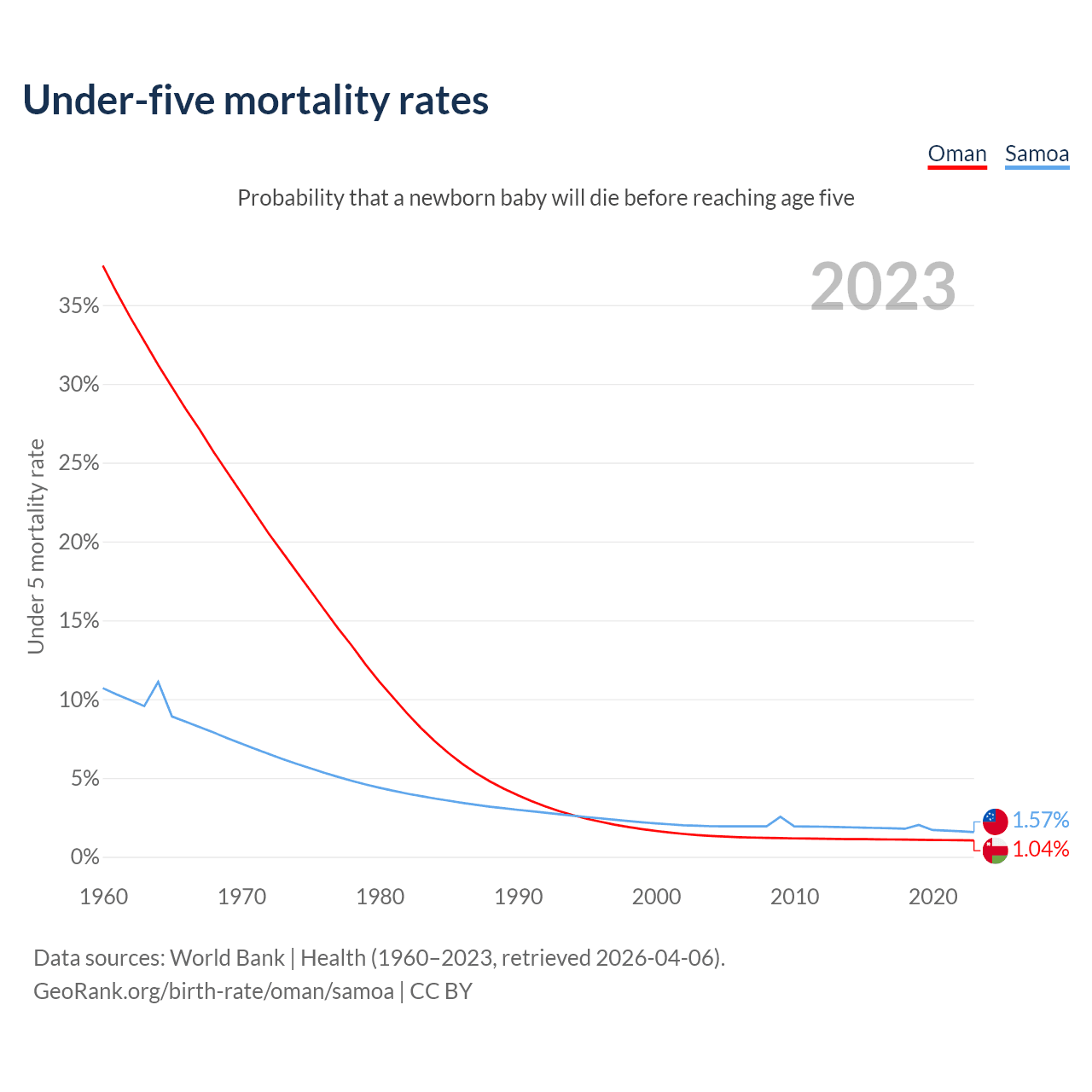 The chance that a newborn baby will die before reaching age five is 1.04% in Oman and 1.57% in Samoa. Above is a chart with historical data on under-five mortality rates.