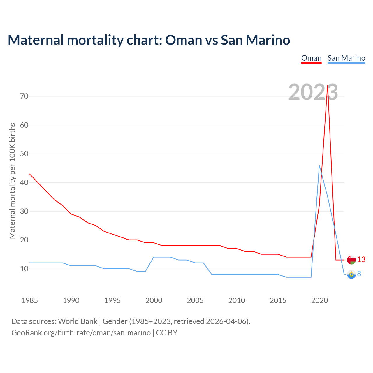 The maternal mortality rate, which is the probability of dying during childbirth or within 42 days of pregnancy termination, is 13 deaths per 100,000 live births in Oman, compared to 8 deaths in San Marino.