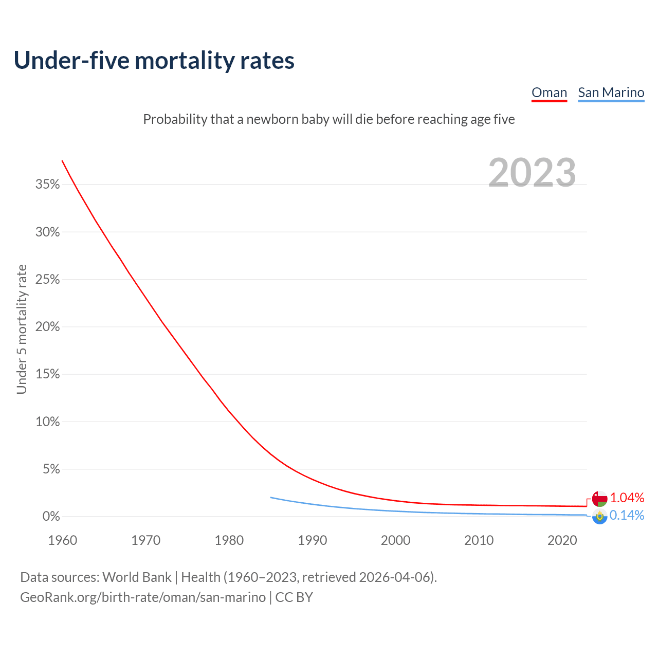The chance that a newborn baby will die before reaching age five is 1.04% in Oman and 0.14% in San Marino. Above is a chart with historical data on under-five mortality rates.